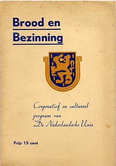 Twee exemplaren van de boek Brood en Bezinning, met de ondertitel 'Corporatief en cultureel program van De Nederlandse Unie'. Op de titelpagina is het blauw-bruine logo gedrukt van de Nederlandse Unie. Het logo stelt de letter 'U' voor met daarin een leeuw. De prijs van de 47 pagina's tellende boek bedraagt 15 cent. De boek beschrijft het programma en de ideeën van de Nederlandse Unie.