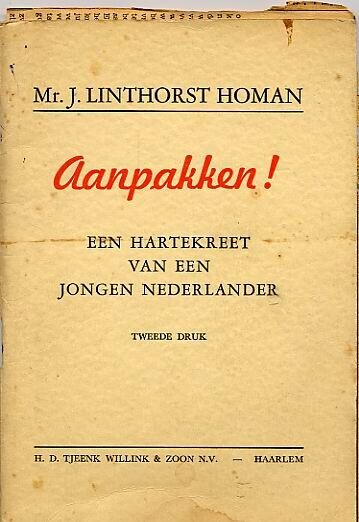 'Aanpakken! Een hartekreet van een jongen Nederlander' is een boek van Mr. J. Linthorst Homan, Commissaris van de Koningin in Groningen. Linthorst Homan was een van de leiders van de Nederlandse Unie. Het betreft de tweede druk van de 32 pagina's tellende boek. <br>Er zijn twee identieke exemplaren. In een exemplaar een krantenknipsel met recensie en een inlegblad met de aankondiging van een boek 'Goede voeding in slechte tijden'.