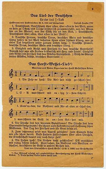 Een blad met Duitstalige liedteksten: "Das Lied der Deutschen" en "Das Horst-Wessel-Lied" (met muziek): tezamen van 1933 tot 1945 het Duitse volkslied; "Unsre Fahne flattert uns voran" (met muziek): het propagandalied van de Hitlerjugend.