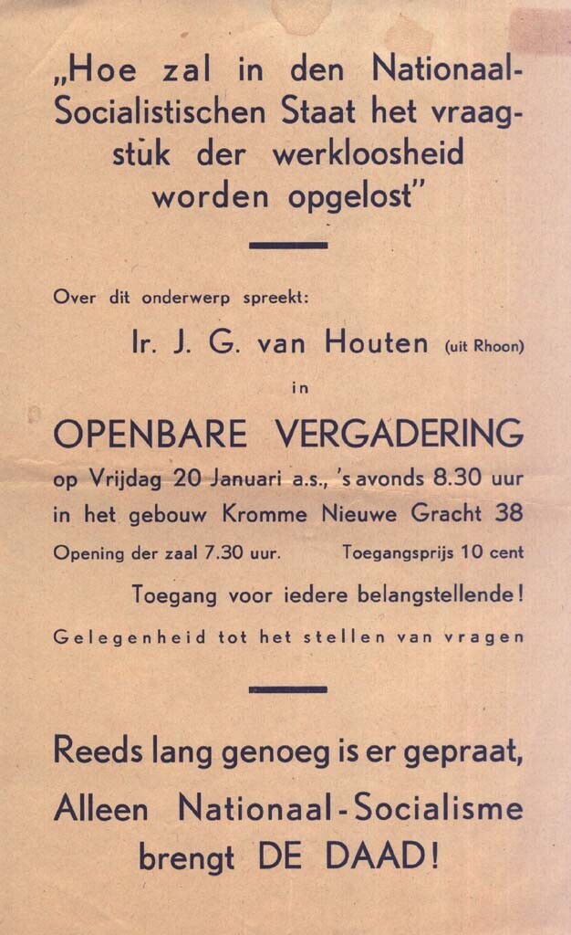 Pamflet met een oproep voor een openbare bijeenkomst van de N.S.B. in Utrecht.