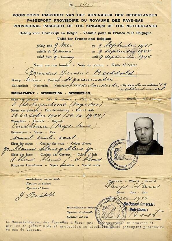 Met pen ingevuld voorgedrukt formulier met als kop (in het Nederlands, Frans en Engels): "Voorlopig paspoort van het Koninkrijk der Nederlanden", uitgegeven te Parijs op 9 mei 1945 aan Gerardus Jacobus Bechtold. Op het document is een pasfoto geniet.