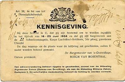 Briefkaart waarmee F.H, Seitzinger ter vervulling van de dienstplicht wordt opgeroepen.