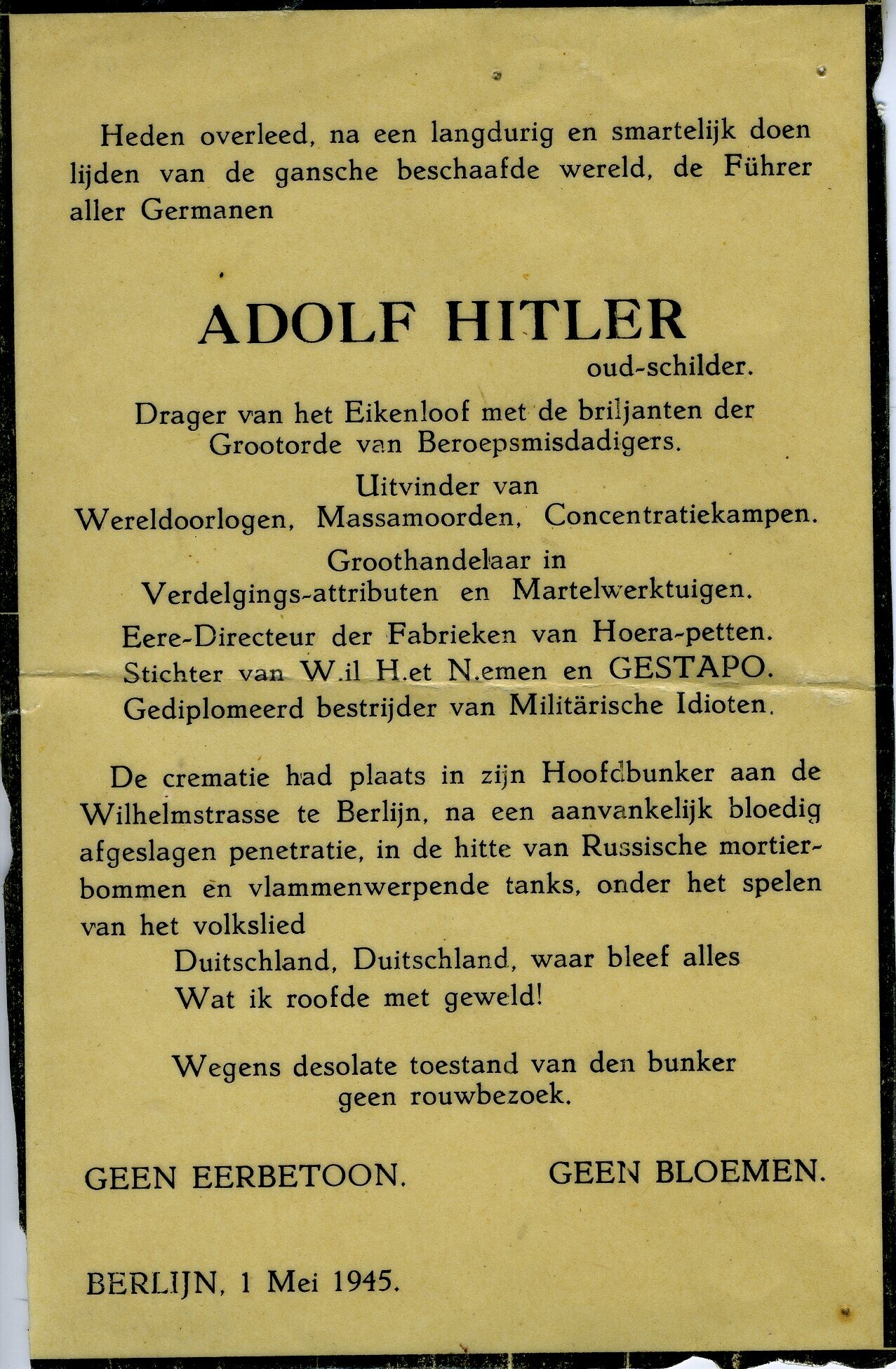 Satirische overlijdensadvertentie van Adolf Hitler met datum: Berlijn, 1 mei 1945.