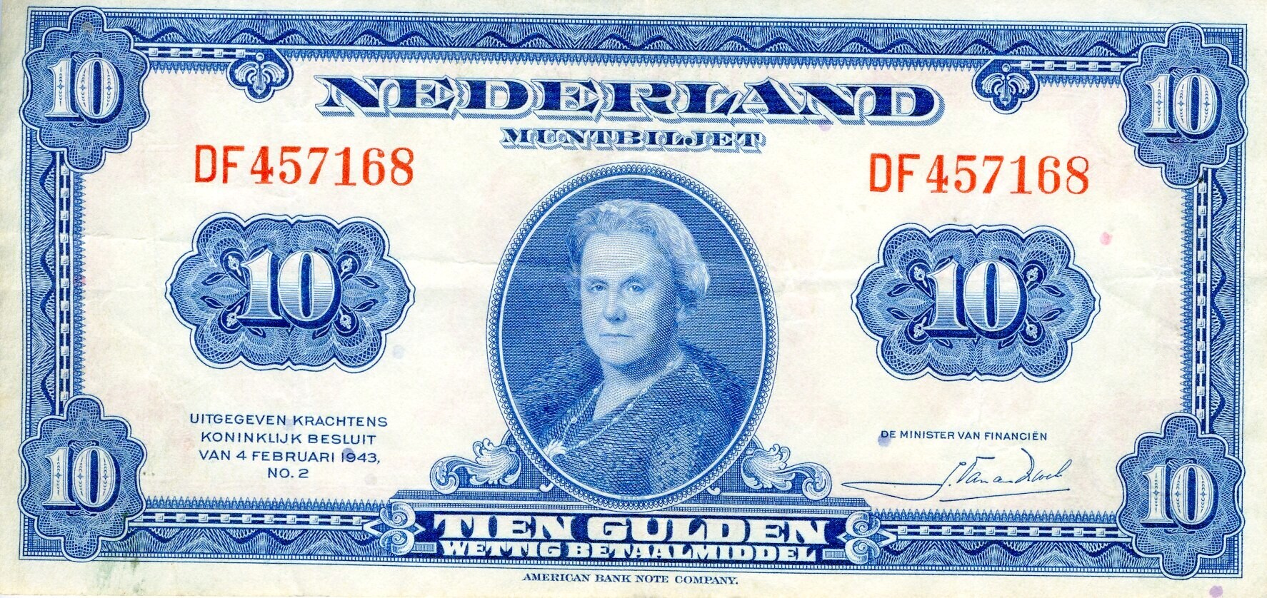 Twee bankbiljetten van 10 gulden met aan één kant blauwe opdruk en een portret van koningin Wilhelmina. Tekst: "Nederland. Muntbiljet. Uitgegeven krachtens Koninklijk besluit van 4 februari 1943. No. 2. Tien gulden. Wettig betaalmiddel. American Banknote Company." Tevens de handtekening van de minister van Financiën. De serienummers zijn in rood gedrukt: "DF457168; DH760174". Op de andere kant oranje opdruk met het Nederlandse wapen en een wetstekst. Deze biljetten werden gebruikt om de Amerikaanse troepen, gelegerd in de zuidelijke provincies, te betalen. Na drie maanden werden ze door de Nederlandse regering weer ingetrokken. Om vervalsingen te voorkomen hebben ze gekleurde stippen in plaats van een watermerk.