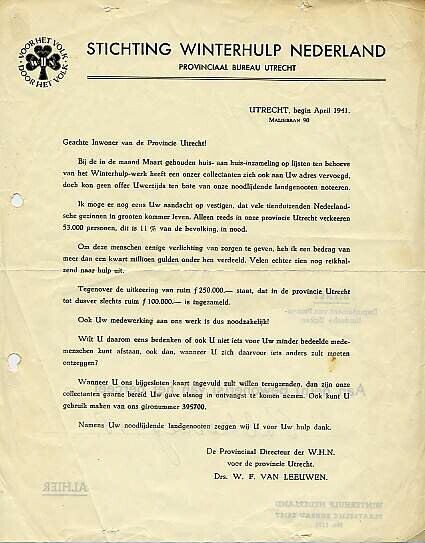 Schrijven van de Stichting Winterhulp Nederland, verspreid onder inwoners van de provincie Utrecht die nog geen geld hebben gegeven, met het verzoek dit alsnog te doen. Bijgevoegd is een kaart waarop de ontvanger de hoogte van zijn bijdrage kan noteren.