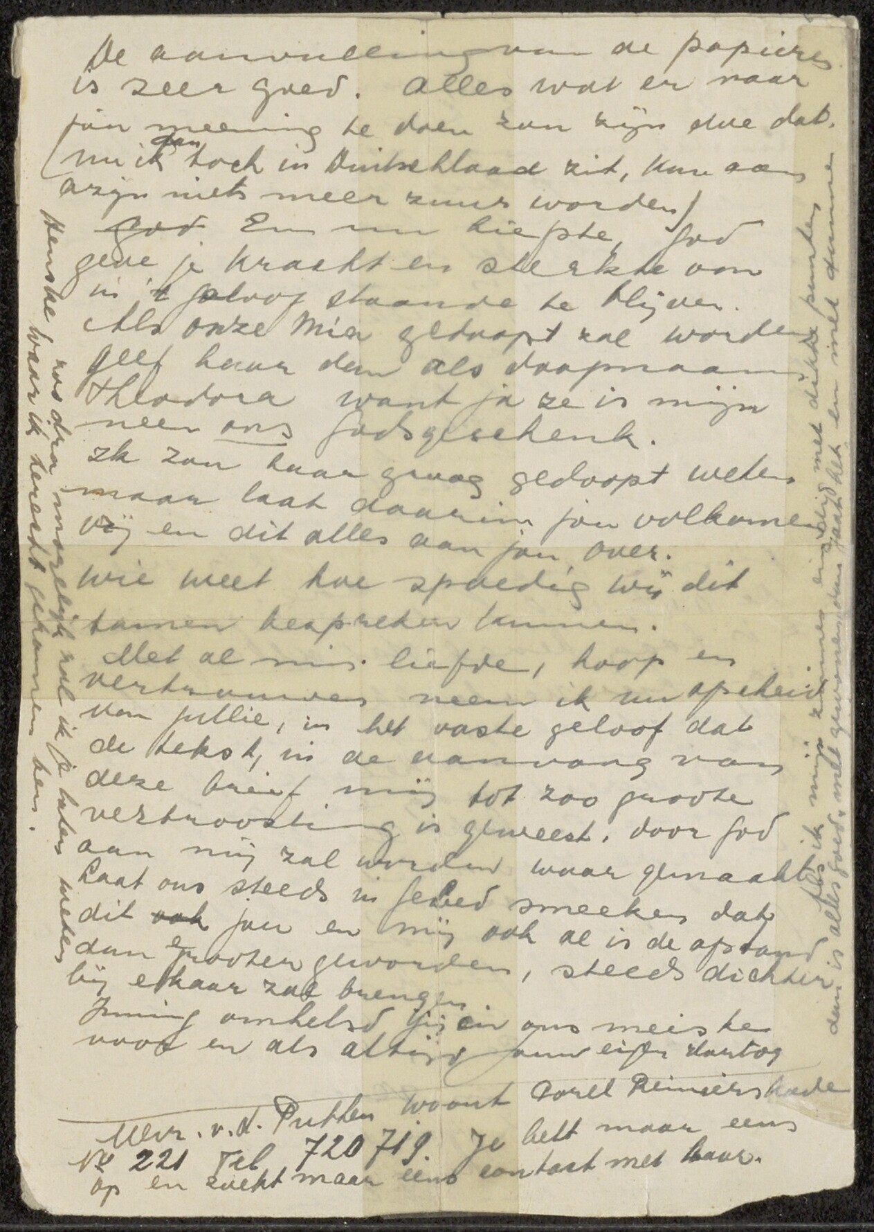 Ongedateerde, met pen geschreven brief op twee vellen papier, die met plakband aan elkaar zijn geplakt. Mogelijk geschreven vanuit de gevangenis Scheveningen.
