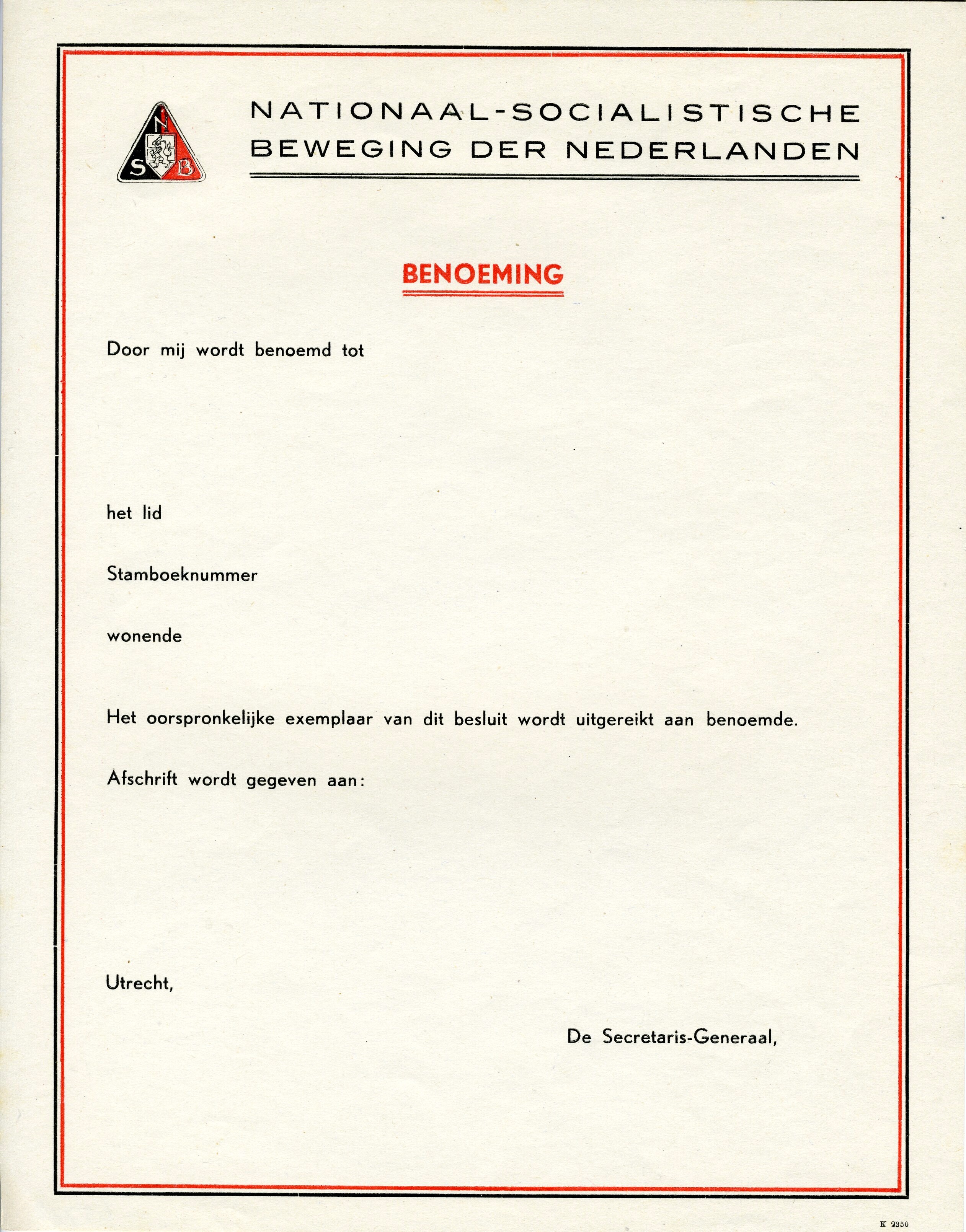 Vier blanco formulieren in kleurendruk met betrekking tot de benoeming van een N.S.B.-lid in een bepaalde functie.
