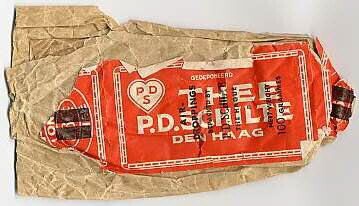 Wit papieren zakje met rood etiket met in wit de opdruk: "Thee P.D. Schilte Den Haag" en daarover heen, in zwart, de opdruk: "Air droppings repacked by P.D. Schilte The Hague".