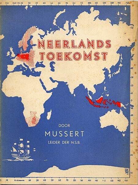 Twee exemplaren van een N.S.B.-uitgave met op de voorkant een wereldkaart. De ''Arische'' gebieden zijn rood gemarkeerd. De boek omvat 32 pagina's. Om een van de exemplaren zit een rode banderol met als opschrift: tweede druk, 26ste tot 50ste duizendtal".