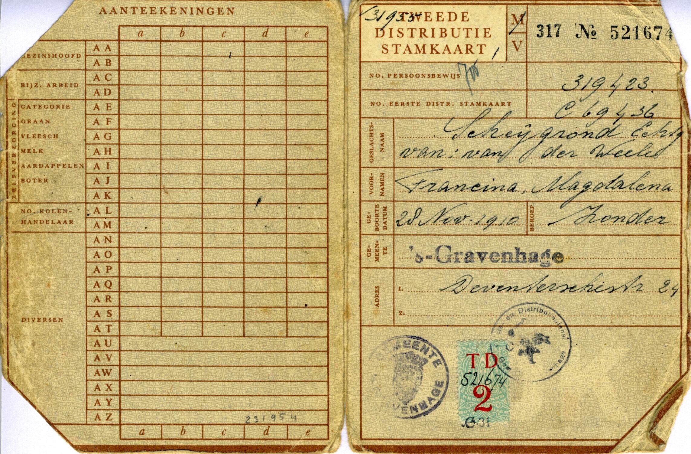 Een Tweede Distributie Stamkaart uitgegeven door de gemeente Den Haag op naam van Francina Magdalena van der Weele-Scheijgrond.