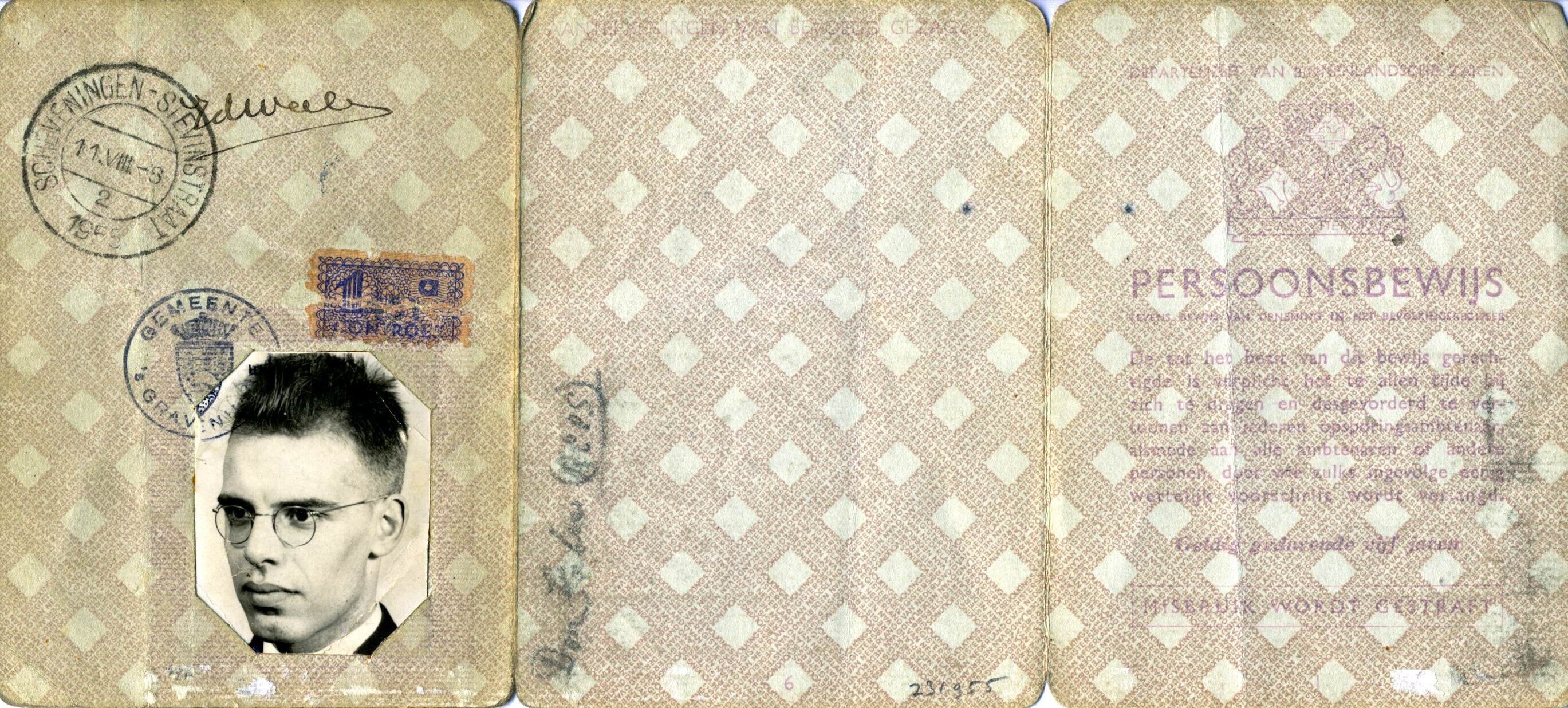 Een persoonsbewijs gesteld op naam van: "Van der Weele, Jan Anthonie, 2 augustus 1912 Giessen Nieuwkerk Z.H." afgegeven op 24 november 1941 te Den Haag. Op het persoonsbewijs zijn twee duimafdrukken geplaatst en een zwart-wit pasfoto van de houder bevestigd.