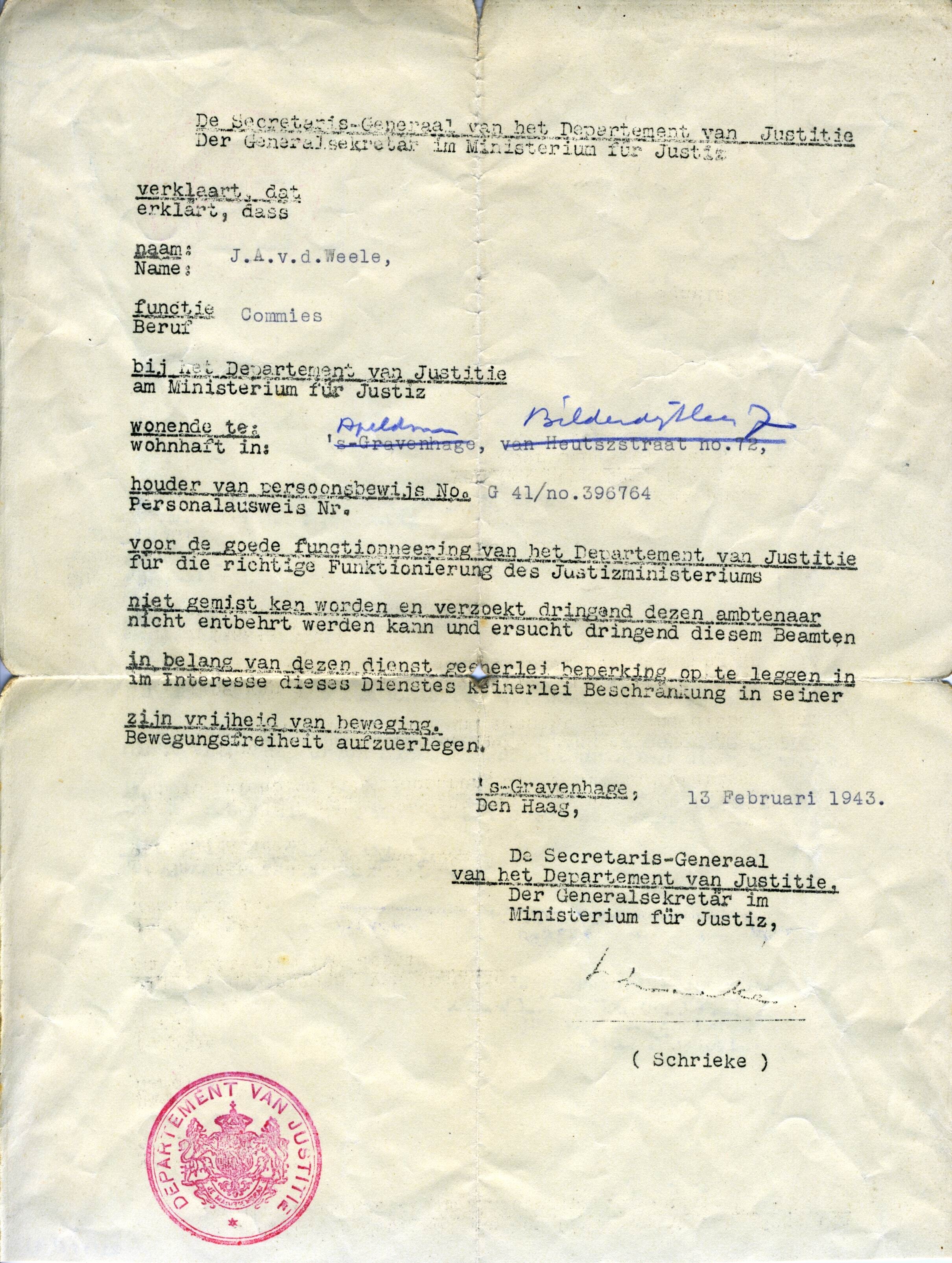 Twee verklaringen opgesteld in het Nederlands en het Duits uit naam van de Secretaris-Generaal van het Departement van Justitie" waarin verzocht wordt J.A. van der Weele " in het belang van dezen dienst geenerlei beperkingen op te leggen in zijn vrijheid van beweging". Eén gedateerd: 's-Gravenhage, 13 februari 1943 en één: Apeldoorn, 6 maart 1944".