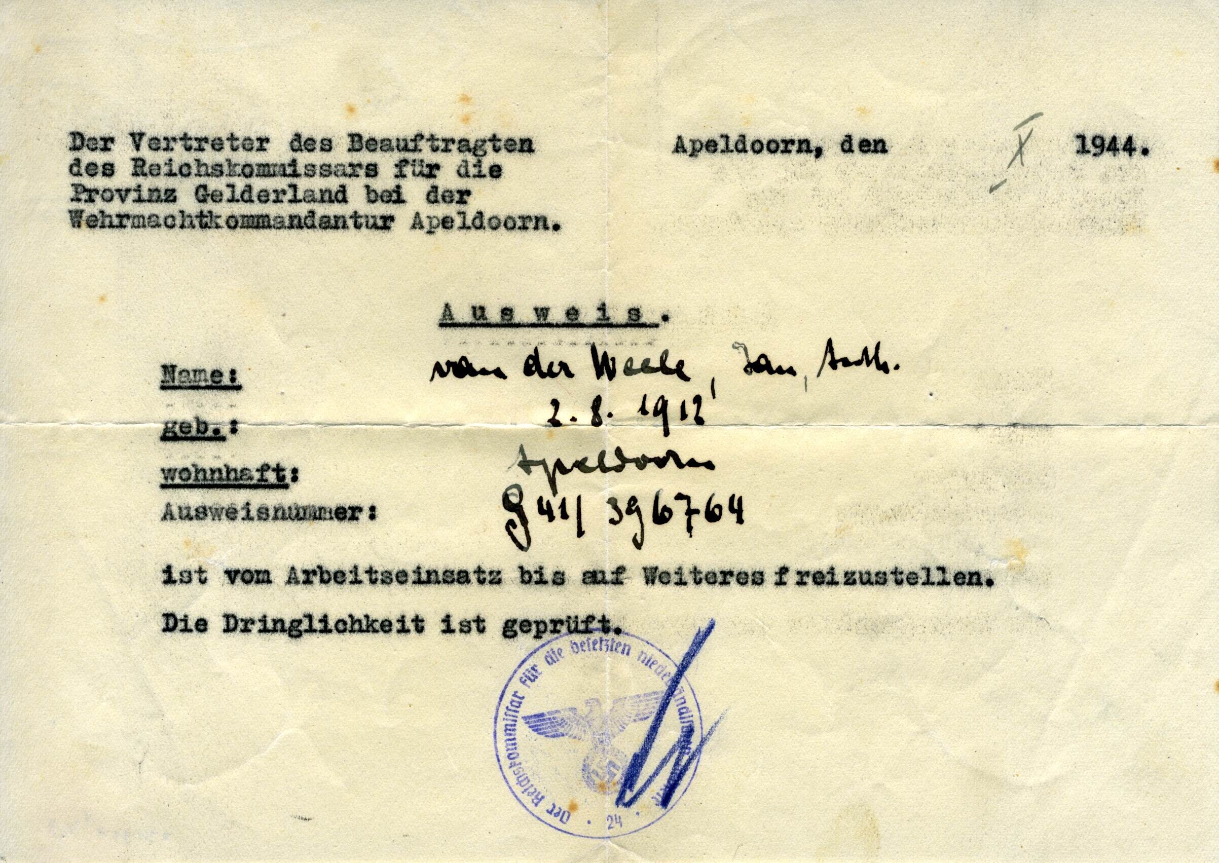 Twee verklaring opgesteld in het Duits door respectievelijk: "Der Vertreter des Beauftragten des Reichskomissaris für die Provinz Gelderland bei der Wehrmachtkommandantur Apeldoorn" en: "Der Reichskommissar für die besetzten Niederländische Gebiete. Der General Kommissar für Verwaltung und Justiz" op naam van J.A. van der Weele, waarin hij vrijgesteld wordt van de Arbeidsinzet. Beide verklaringen gedateerd eind 1944.