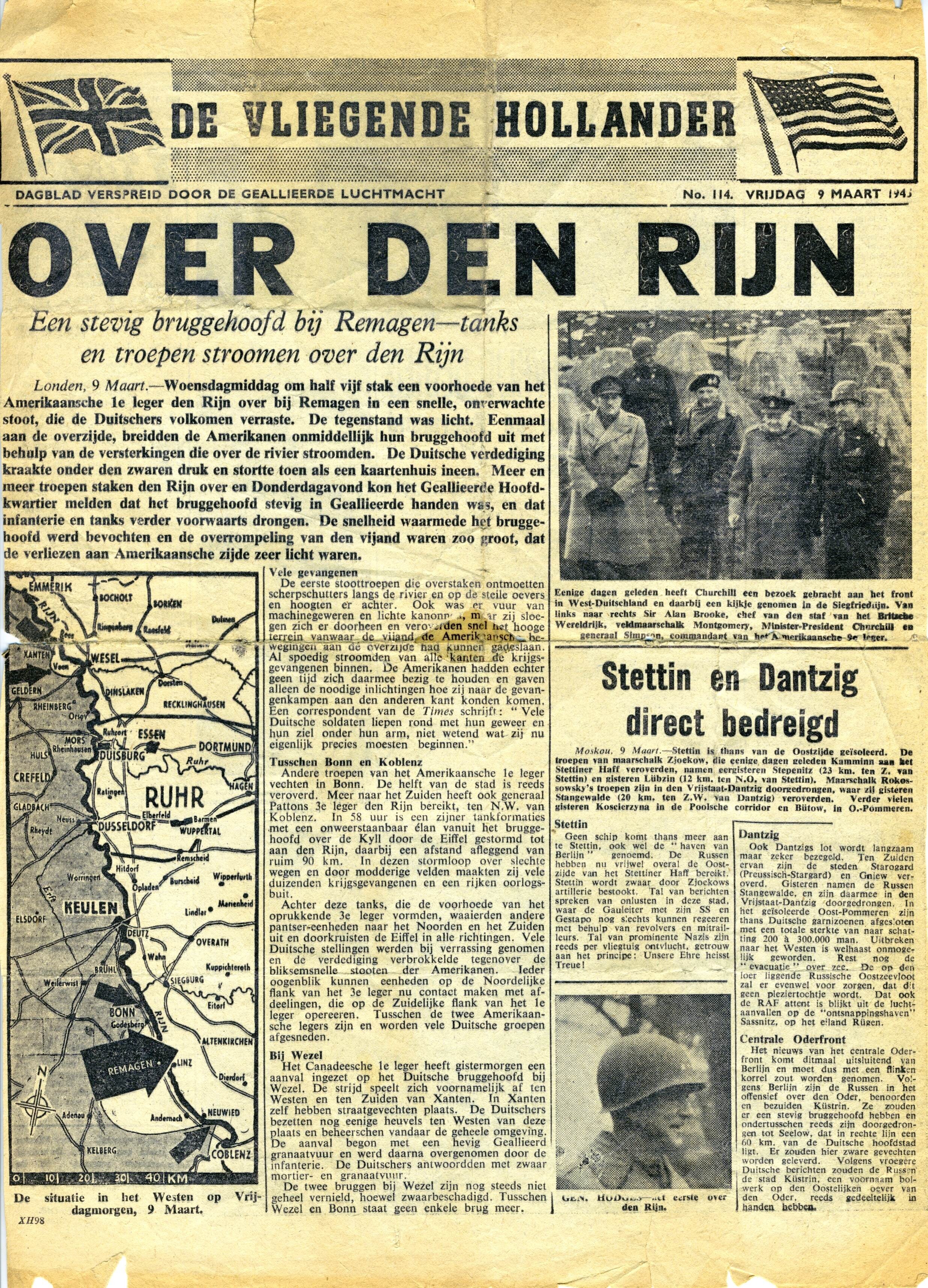 Het weekblad "De Vliegende Hollander" dat door de geallieerde luchtmacht boven Nederland werd uitgestrooid. Het gaat om nr.114, donderdag 8 maart 1945. Het nummer gaat over de opmars van de geallieerden in Duitsland.