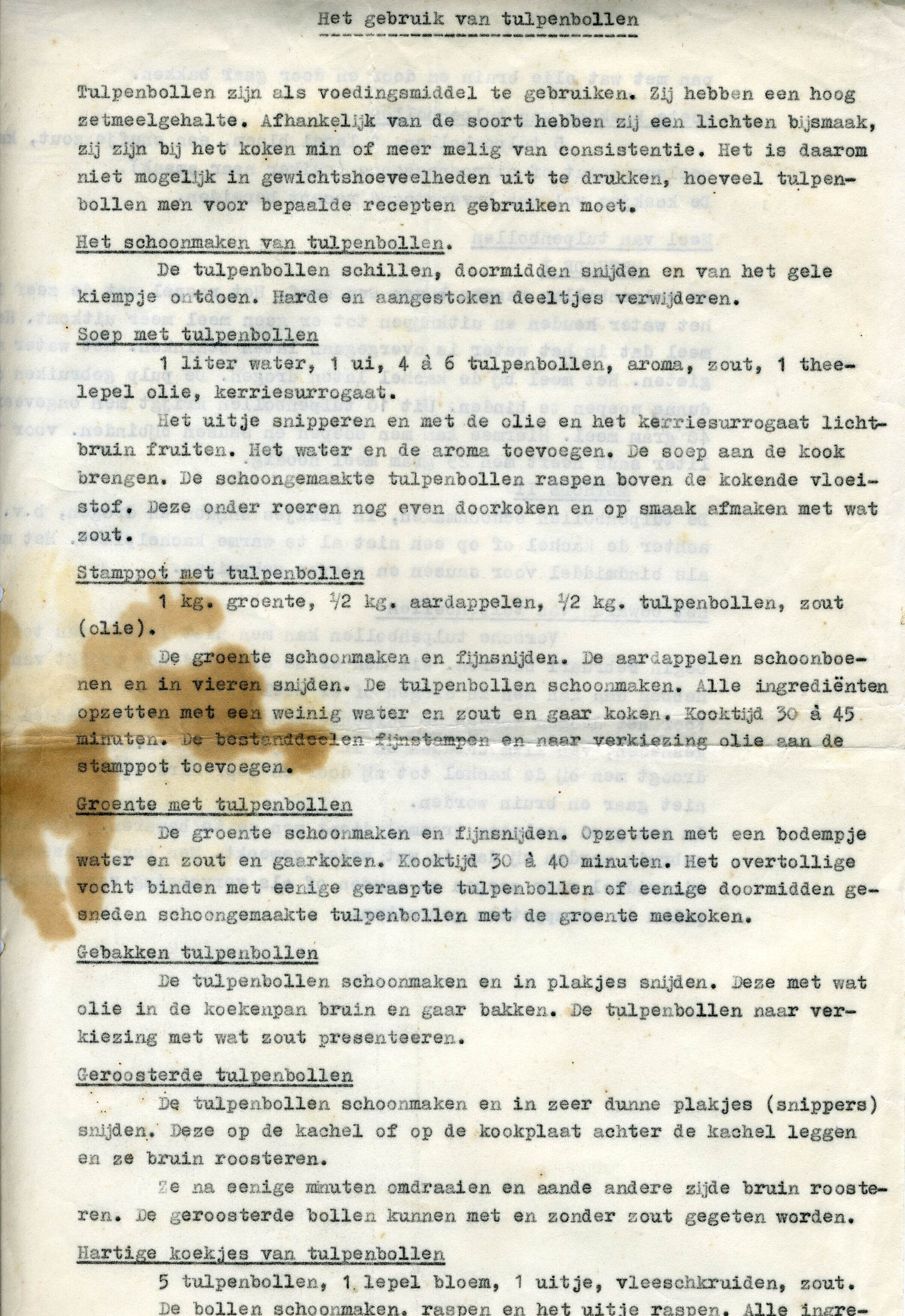 Een getypt blad over "Het gebruik van tulpenbollen" als voedingsmiddel.