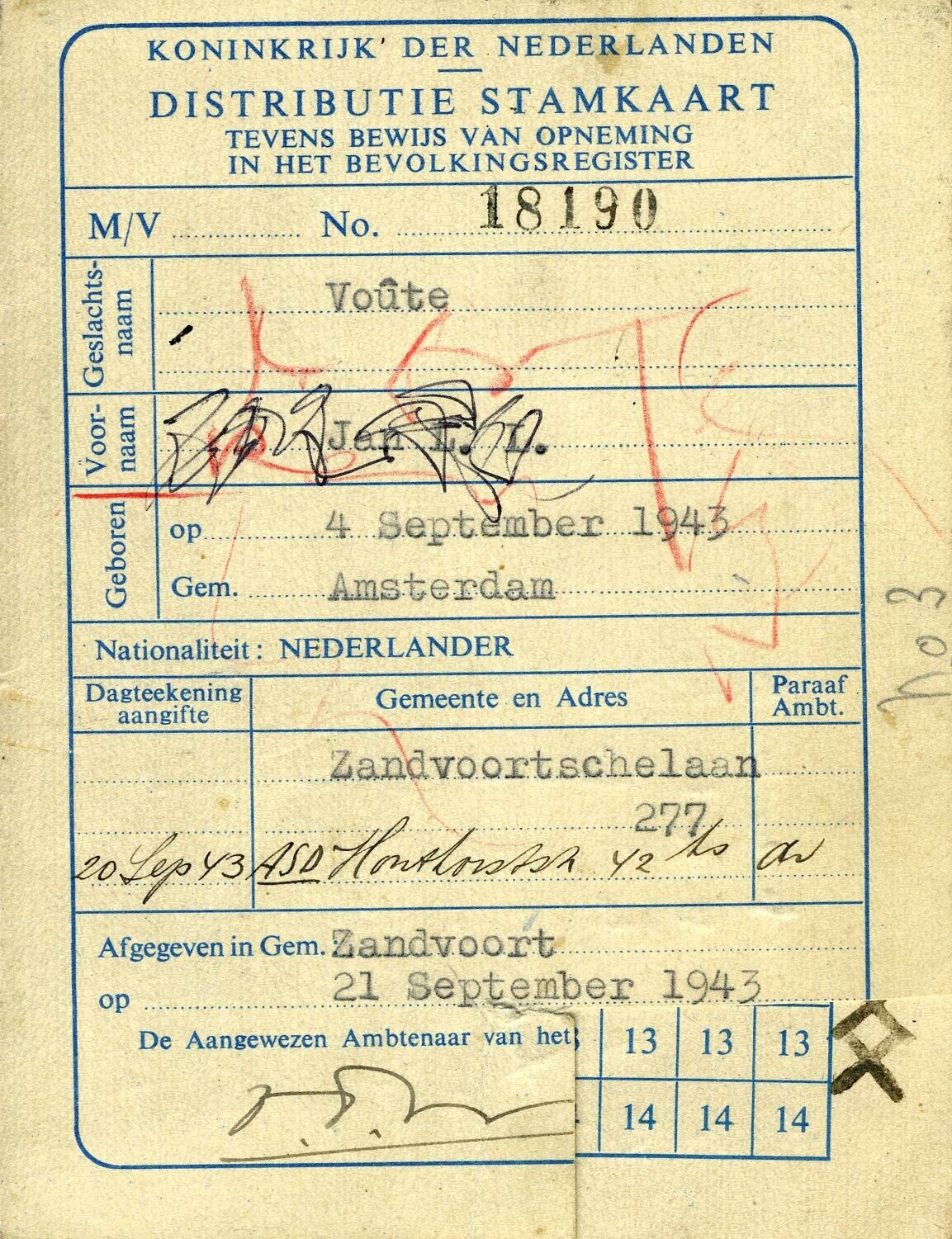Drie exemplaren van de "Distributie stamkaart" op de namen van: Jan Reinier Voûte, 16 september 1908; Gerarda Johanna Theodora Voûte-Reijmers, 6 november 1905; Jan Lodewijk L. Voûte, 4 september 1943.