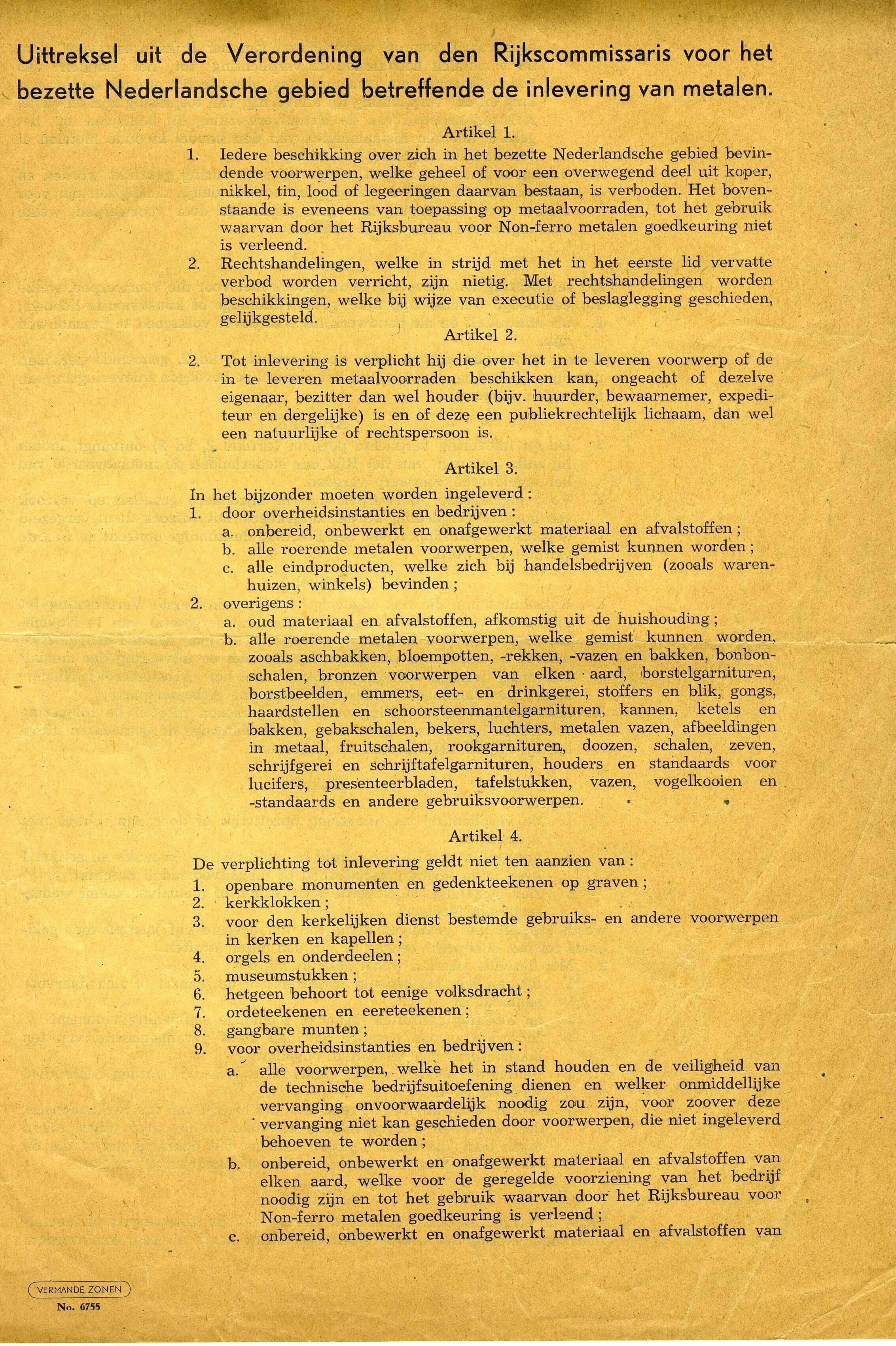 Uittreksel uit de Verordening van den Rijkscommissaris voor het bezette Nederlandsche gebied betreffende de inlevering van metalen