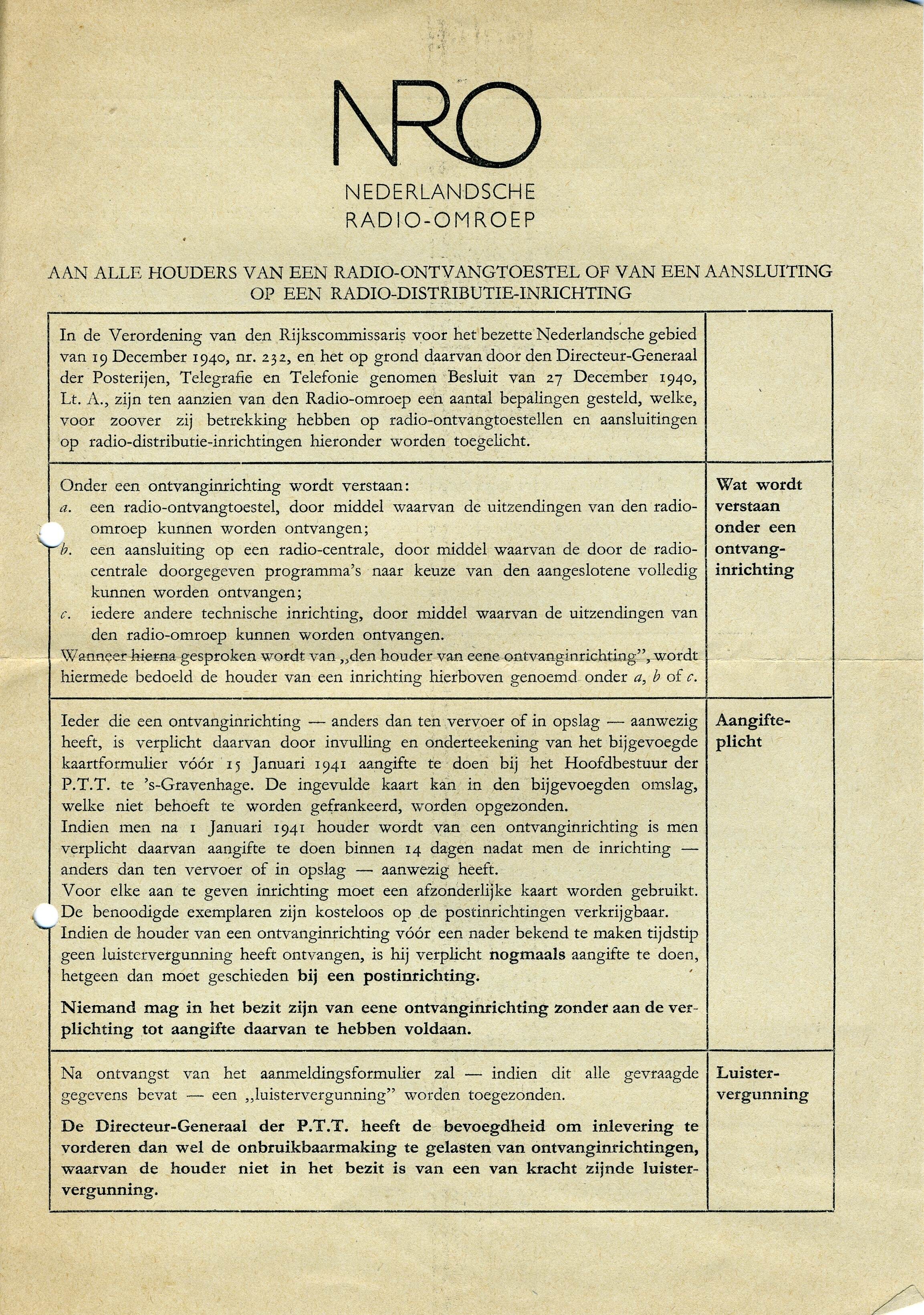 Correspondentie aan de houders van "Radio-ontvangtoestellen" o.a. over de aangifteplicht en de luistervergunning bestaande uit een schrijven van de Nederlandsche Radio-Omroep met de plichten van de houders van de radio's, een schrijven van de PTT over de luistervergunning een oningevulde kaart van de Nederlandsche Radio-Omroep over bezit en gebruik van een radio en twee PTT-enveloppen van de Nederlandsche Radio-Omroep: één aan alle houders van een radio en één gericht aan het hoofdbestuur der PTT.