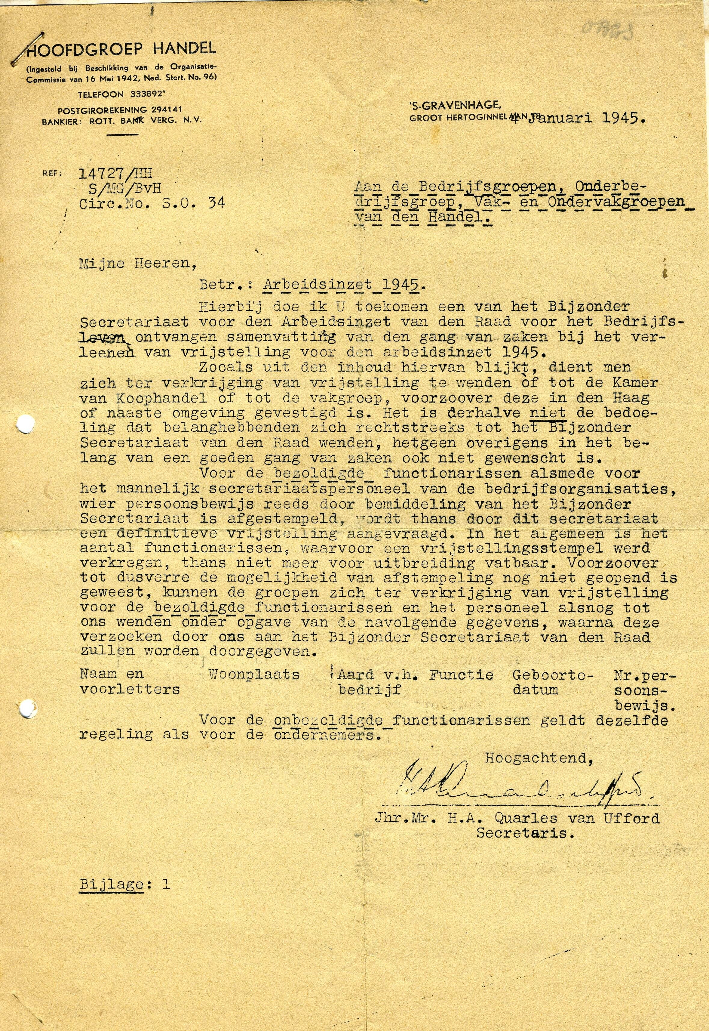 Een brief van de Hoofdgroep Handel aan de Bedrijfsgroepen, Onderbedrijfsgroep, Vak- en Ondervakgroepen van den Handel over de Arbeidsinzet 1945, gedateerd: 's-Gravenhage, 4 januari 1945 en ondertekend door Jhr. Mr. H.A. Quarles van Ufford. Aangehecht is een twee bladzijde tellende bijlage met de kop: "Regelingen Arbeidsinzet 1945".