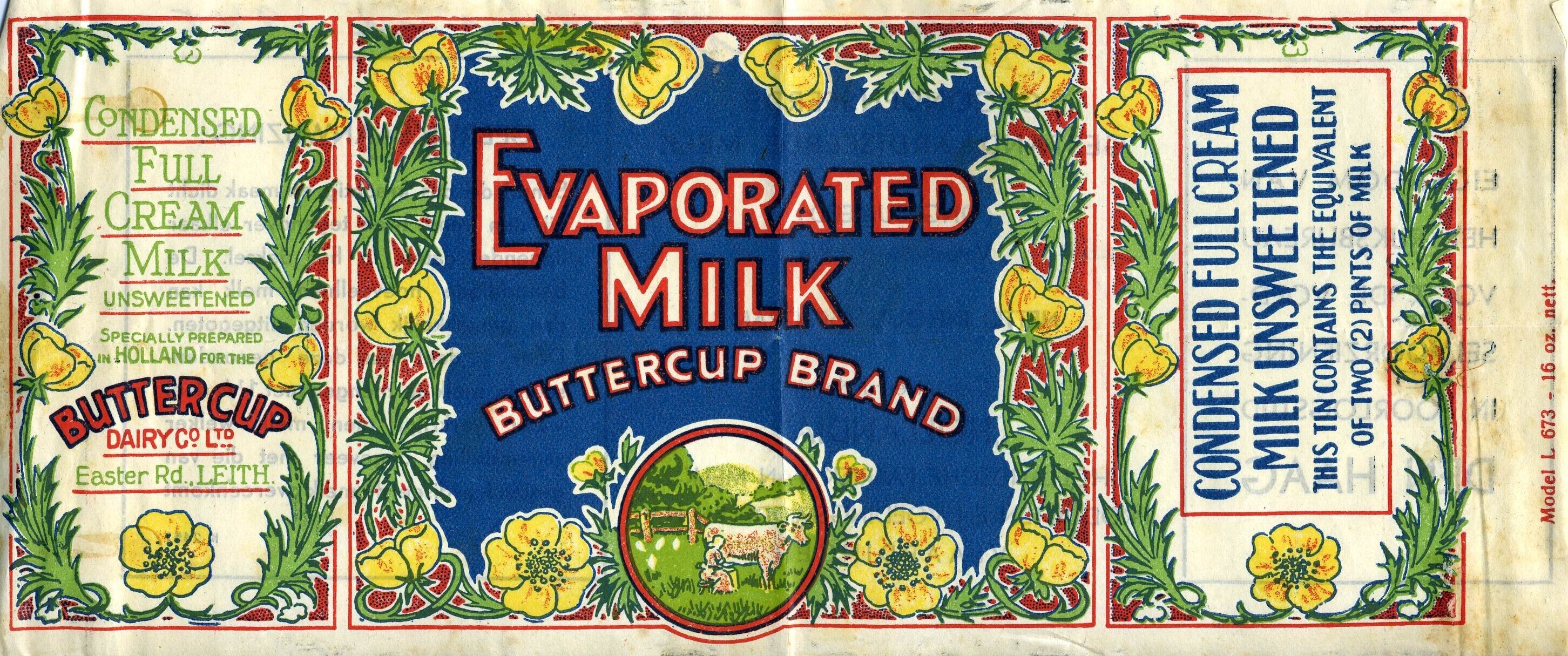 Drie papieren wikkels van: "Evaporated Milk Buttercup Brand". Op de achterkant van de wikkel staat: "Eigendom van het Rijksbureau voor de voedselvoorziening in oorlogstijd Den Haag" en: "Gecondenseerde melk (ongesuikerd) Vetgehalte 6.2% Netto inhoud 450 gram. Gefabriceerd door "Hollandia" Hollandsche fabriek van melkproducten en voedingsmiddelen N.V. Vlaardingen".