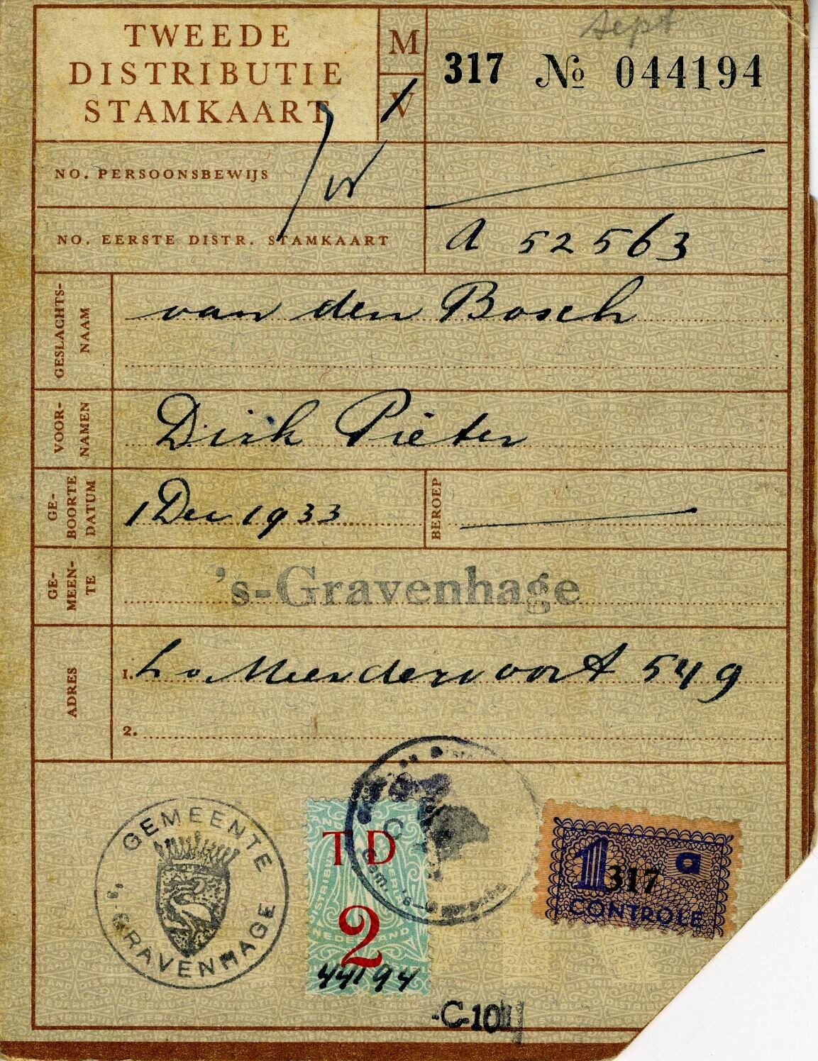 Een "Tweede Distributie Stamkaart" uitgegeven te Den Haag. Het bewijs is gesteld op naam van Dirk Pieter van den Bosch, geboren op 1 december 1933 te 's-Gravenhage en wonende aan de Laan van Meerdervoort 549 te Den Haag. Op de distributiestamkaart staan de uitgereikte bonnen en bonkaarten genoteerd. De kaart draagt het stempel van de gemeente Den Haag.