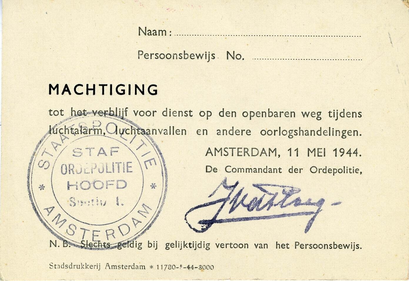 Een oningevulde "Machtiging tot het verblijf voor dienst op den openbaren weg tijdens luchtalarm, luchtaanvallen en andere oorlogshandelingen" uitgegeven te Amsterdam op 11 mei 1944 door de commandant van de ordepolitie. Mogelijk gaat het hier om een vervalsing of gestolen exemplaar. De lege machtiging werd gebruikt door het verzet.
