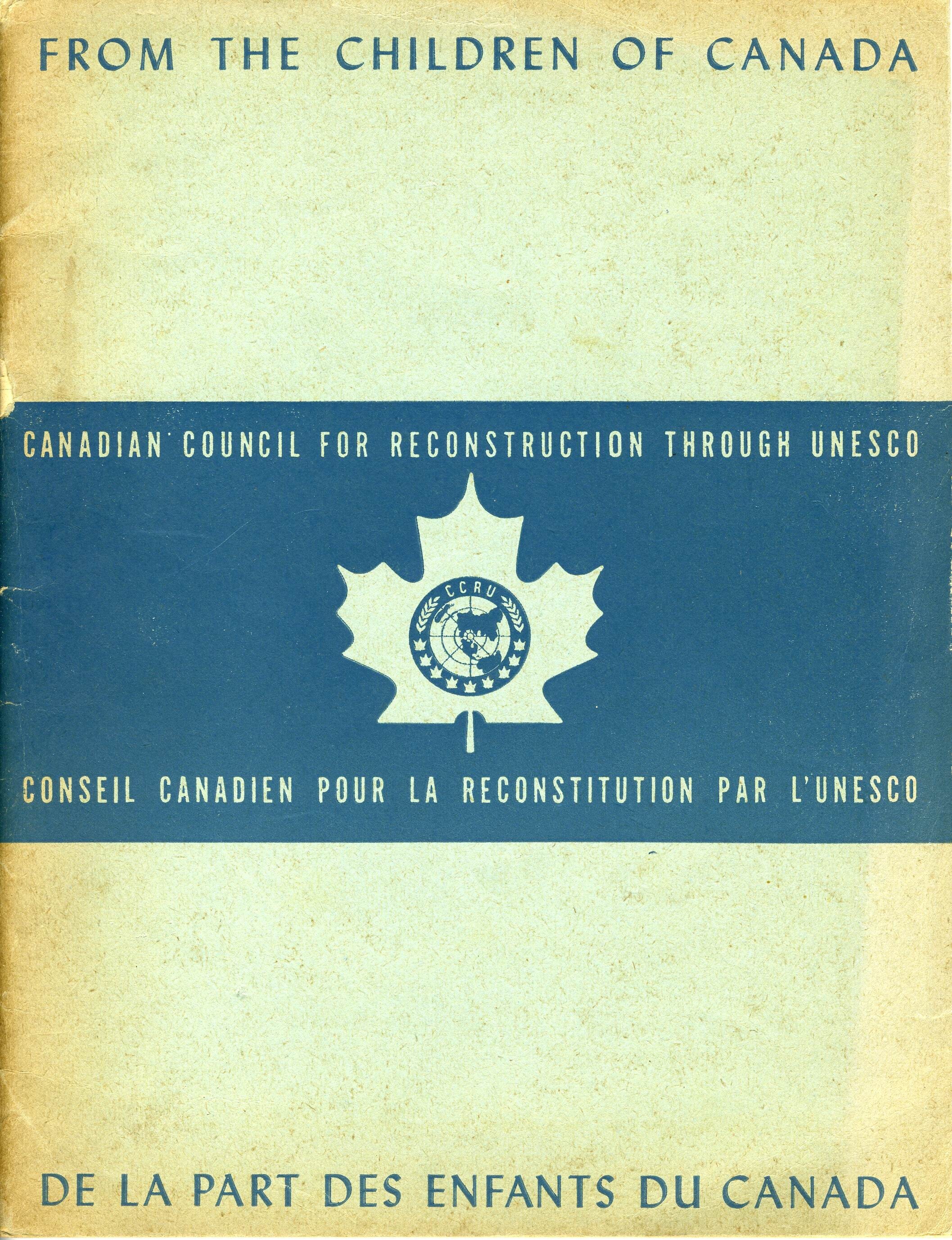 Een gelinieerd blanco schoolschrift met op de voorkant bovenaan: "From the children of Canada". In het midden een blauwe band met daarop: "Canadian Council for reconstruction through UNESCO", de Maple Leaf, symbool van Canada, met in het midden het logo van de CCRU en daaronder: "Conseil Canadien pour la reconstitution par l'UNESCO". Onderaan: "De la part des enfants du Canada".