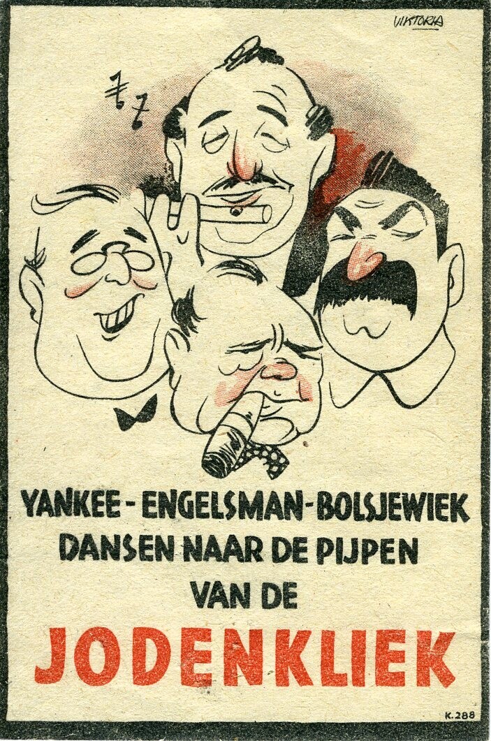 Een aan beide kanten bedrukt pamflet karikaturen van Stalin, Churchill, Roosevelt en een fluitspeler en de tekst: "Yankee - Engelsman - Bolsjewiek dansen naar de pijpen van de Jodenkliek". Gesigneerd: "Viktoria".<br>