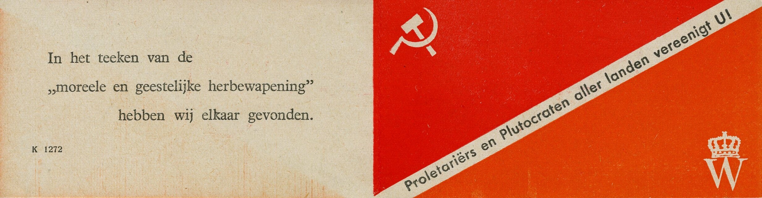 Een dubbelgevouwen gedrukt pamflet met de symbolen van het communisme en een gekroonde "W" van koningin Wilhelmina met elkaar verbonden met een ketting. Tekst: "Proletariërs en Plutocraten aller landen vereenigt U!" en "In het teeken van de "moreele en geestelijke herbewapening" hebben wij elkaar gevonden."