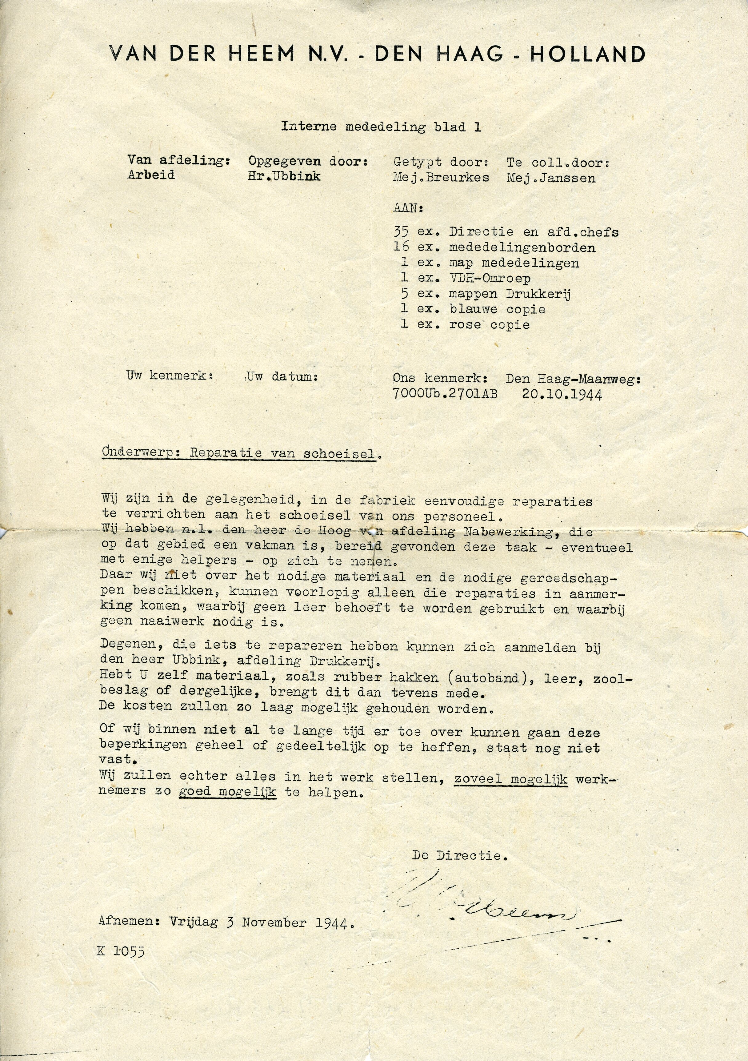 Een getypte brief gericht aan het personeel van "Van der Heem N.V." te Den Haag waarin wordt aangegeven dat in de fabriek eenvoudige schoenreparaties kunnen worden verricht. Hierbij wordt de kanttekening gemaakt dat: "Daar wij niet over het nodige materiaal en de nodige gereedschappen beschikken, kunnen voorlopig alleen die reparaties in aanmerking komen, waarbij geen leer behoeft te worden gebruikt en waarbij geen naaiwerk nodig is." Op de achterkant staat met potlood de tekst van een bevel dat op last van de Duitse Weermacht alle mannen in de leeftijd van 17 t/m 40 jaar zich moeten melden voor de arbeidsinzet.