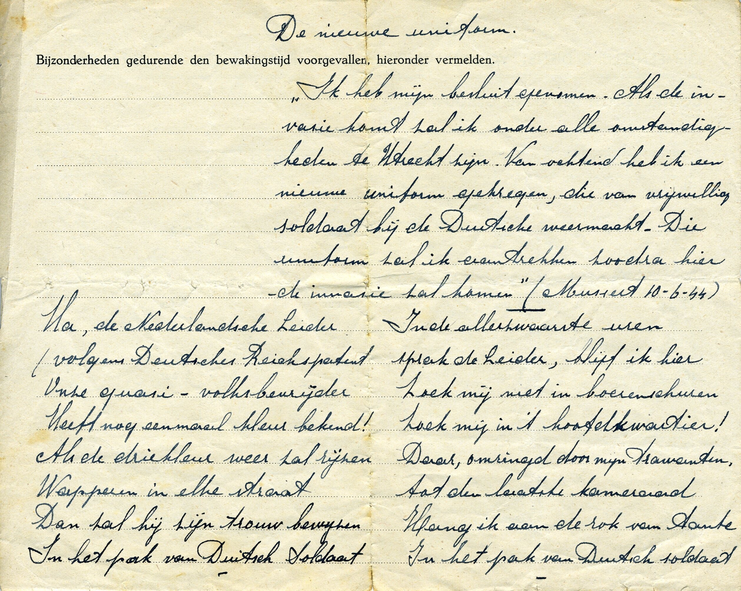 Een op de achterkant van een formulier van de "Gemeentelijke Dienst voor Maatschappelijk hulpbetoon te 's-Gravenhage" met pen geschreven satirisch gedicht met als onderwerp de NSB-leider Mussert.