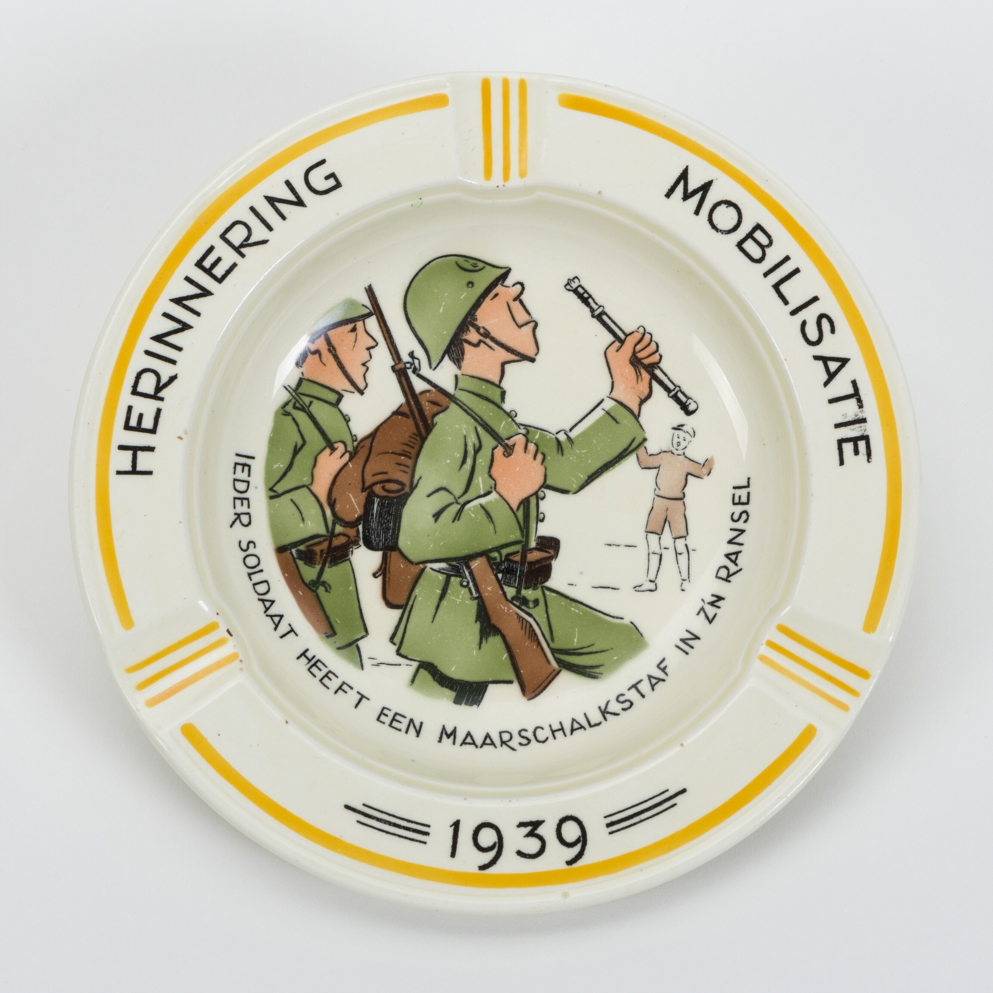 Een geglazuurde aardewerken asbak met op de rand de tekst: "Herinnering Mobilisatie 1939". In het midden een voorstelling van twee soldaten, Eén van de soldaten houdt een staf in zijn hand. Op de achtergrond een toeschouwer. Onder de afbeelding de tekst: "Iedere soldaat heeft een maarschalkstaf in z'n ransel". Op de achterkant van de asbak: "Sociéte Céramique Maestricht Made in Holland".