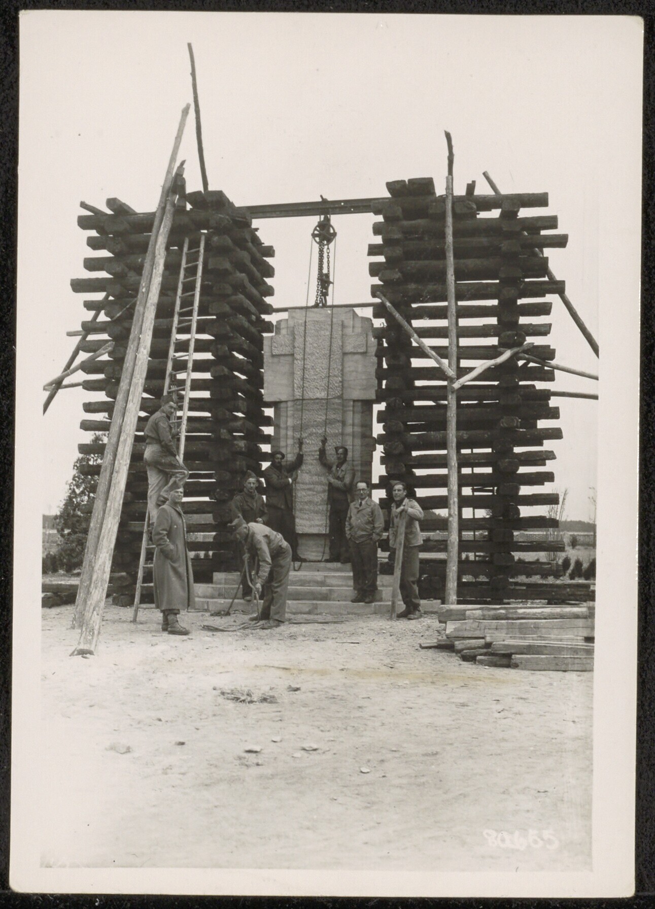 Twee zwart-wit foto's van de opbouw van een monument ter nagedachtenis van overleden krijgsgevangenen en een rij graven bij het krijgsgevangenenkamp Mühlberg an der Elbe.