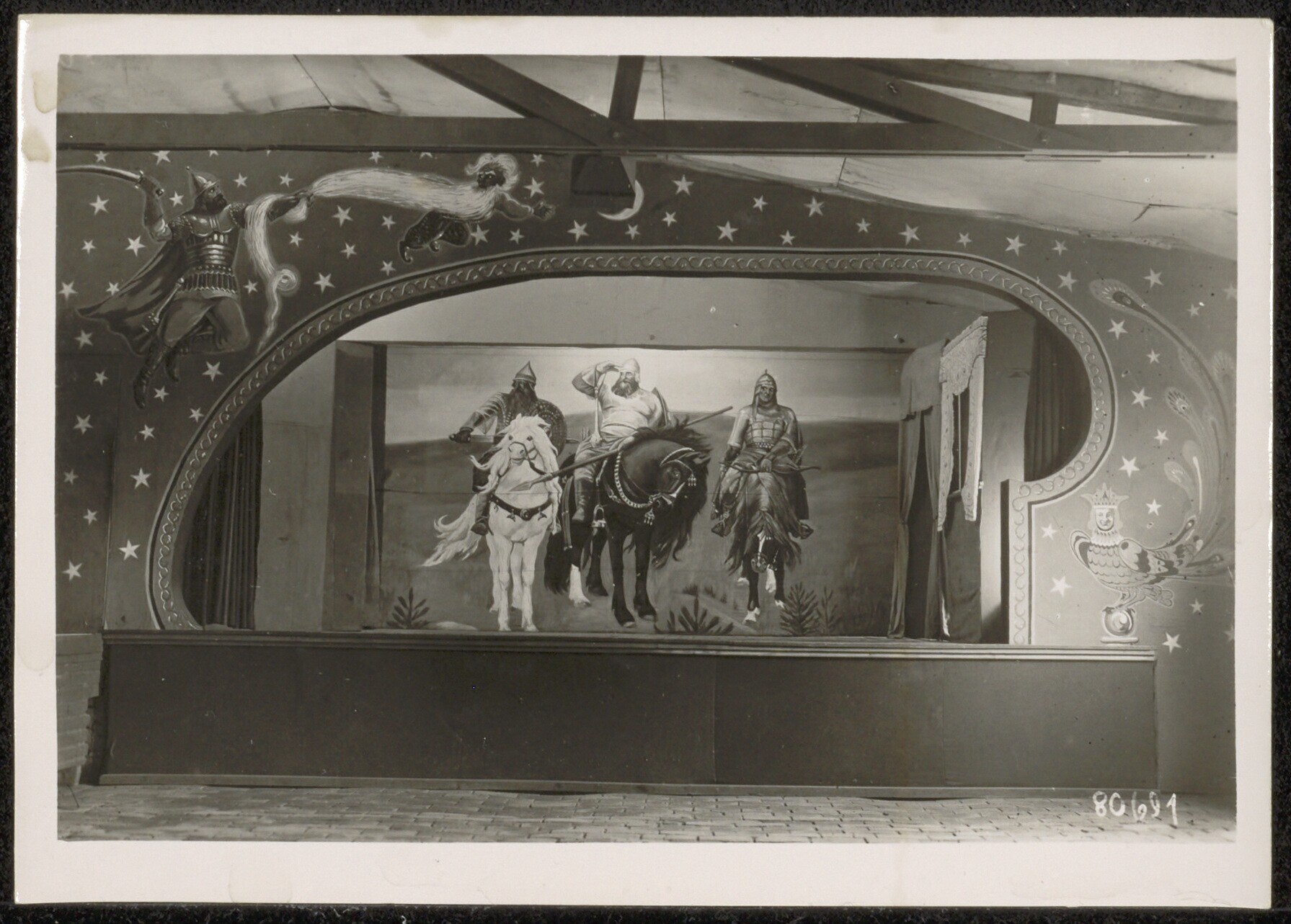 Een zwart-wit foto van het theater in het krijgsgevangenenkamp Mühlberg an der Elbe.
