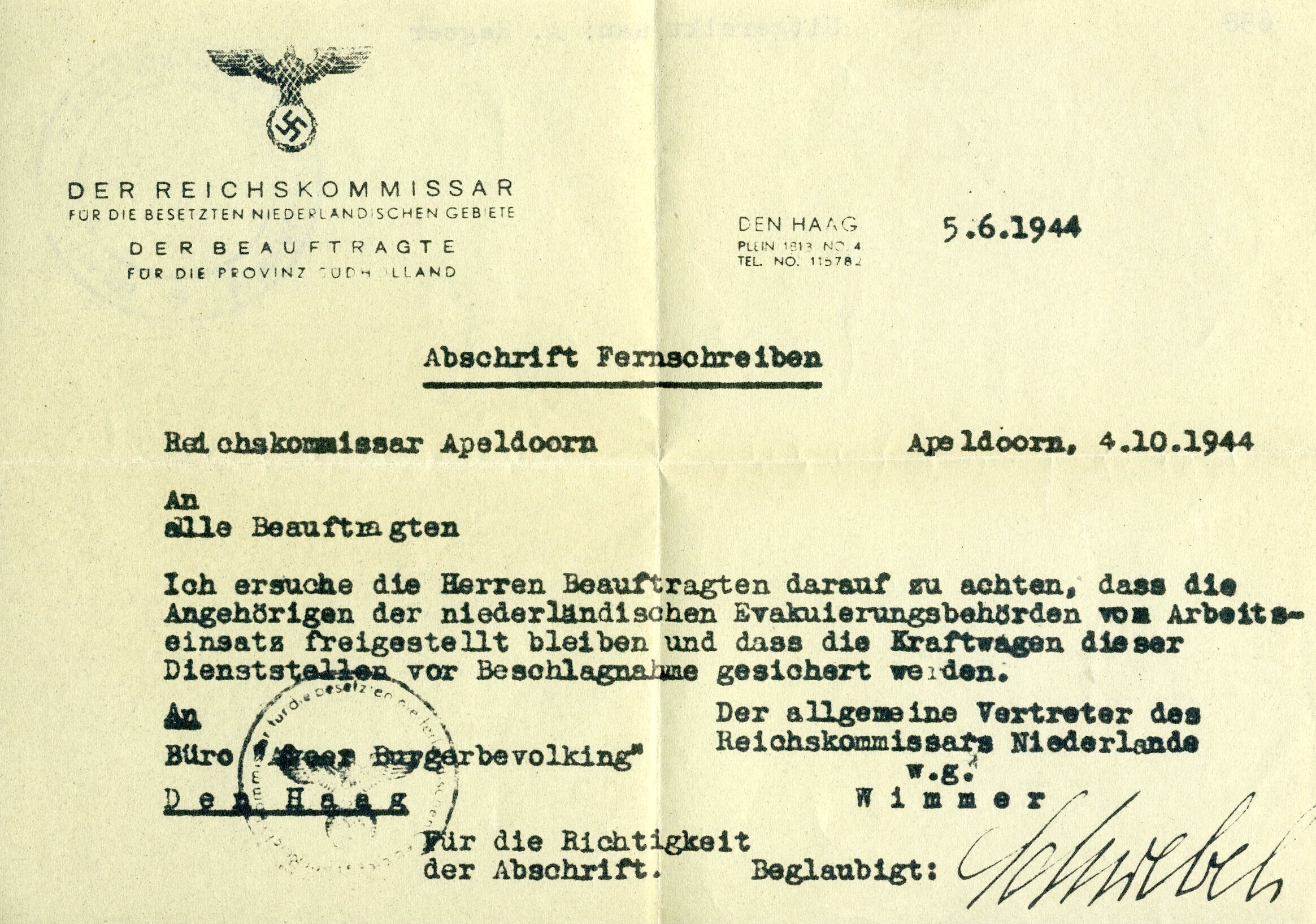 Een gedrukte in het Duits opgestelde verklaring op waarin de werknemers van de Nederlandse evacuatiebureaux vrijgesteld zijn van de Arbeidsinzet.
