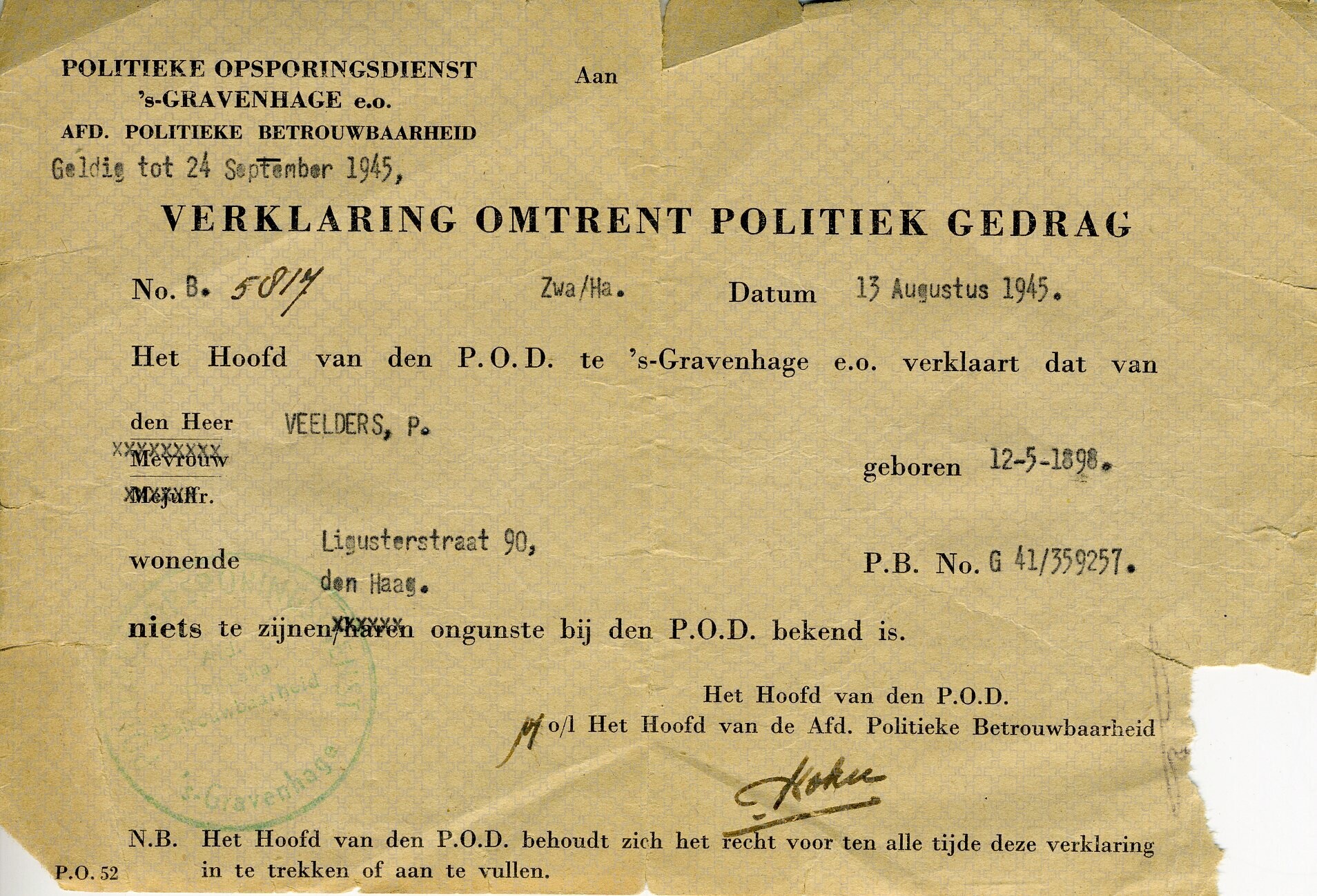 Een gedrukte en met getypt ingevulde verklaring van de "Politieke Opsporingsdienst ´s-Gravenhage e.o. Afd. Politieke Betrouwbaarheid" met als aanhef: "Verklaring omtrent politiek gedrag". In deze verklaring wordt aangegeven dat over de heer P. Veelders niets ongunstigs bekend is. Hij had de verklaring nodig voor een sollicitatie bij justitie.