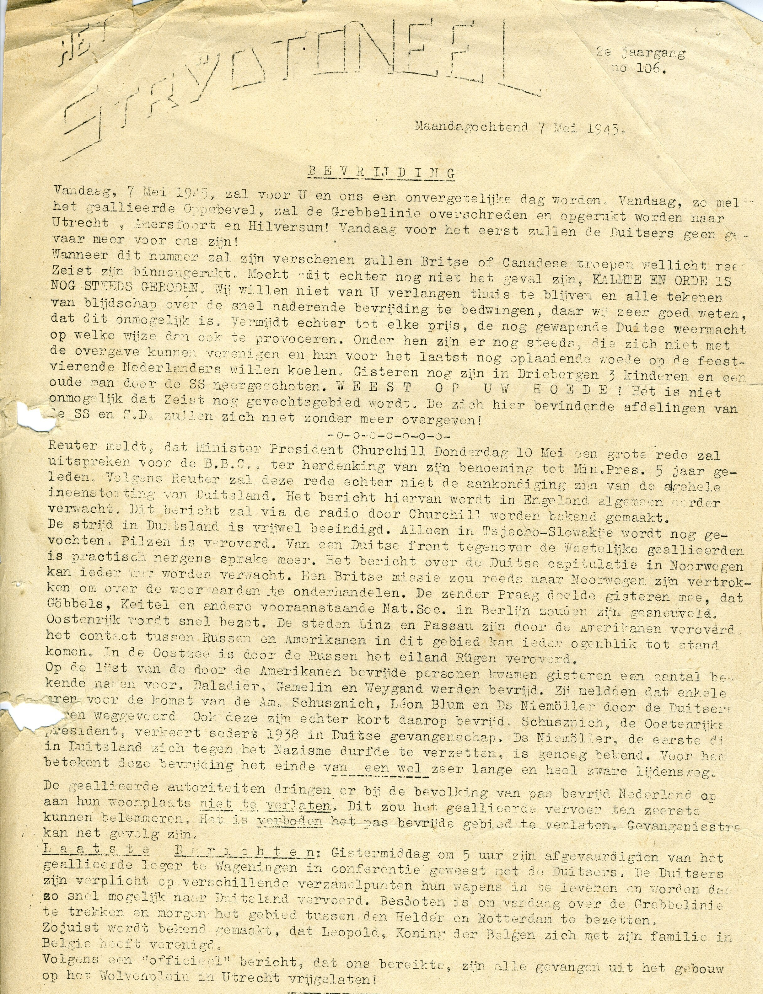 Een uitgave van het gestencilde verzetskrantje "Het Strijdtoneel, 2e jaargang no 106. Maandagochtend 7 Mei 19475."