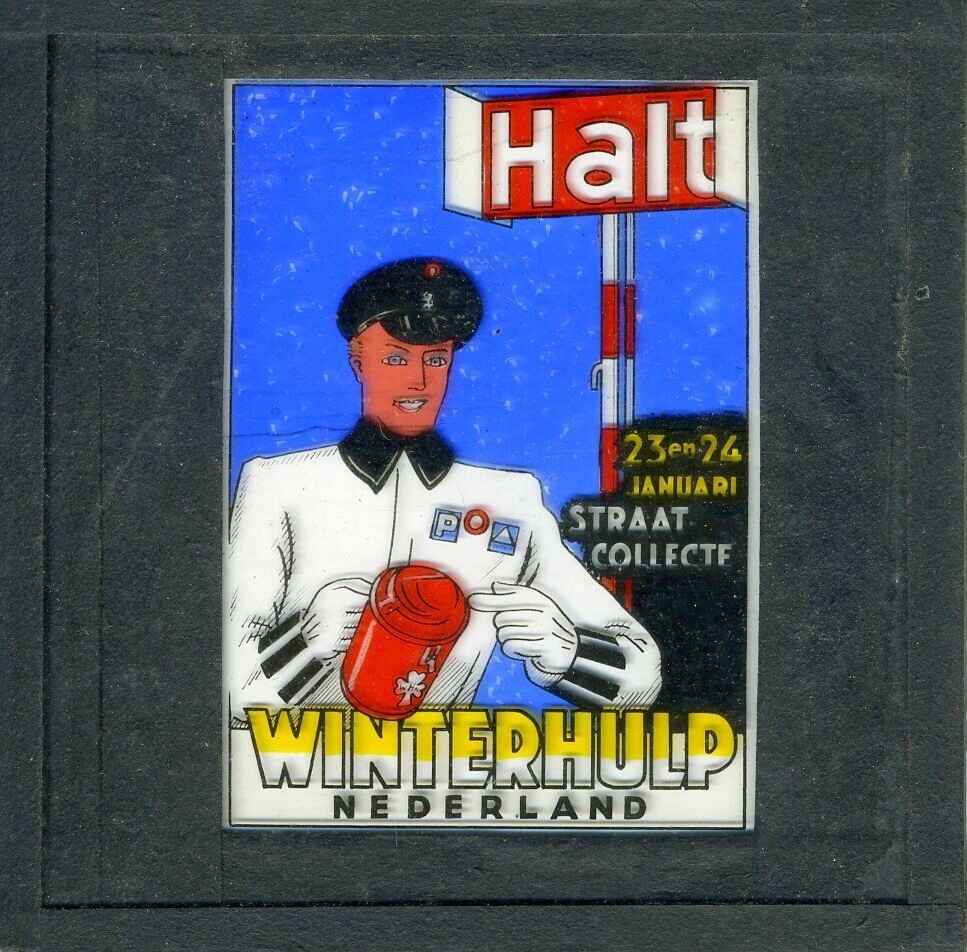 Een ingekleurd lantaarnplaatje met een zwart papieren rand. Op het plaatje is een man in uniform met een collectebus afgebeeld naast een verkeersbord met: "Halt". De overige tekst luidt: "23 en 24 januari Winterhulp Nederland".