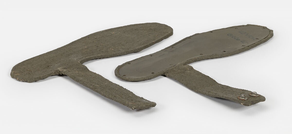 Twee elektrische voetzoolverwarmers voor Duitse soldaten. De verwarmers zijn gemaakt in de vorm van een voetzool uit een metalen plaat op canvas met een uitstekende canvas band met twee metalen drukknopen. Op elk van de verwarmers staat in zwarte sjablonen: "12 Volt Grösse 42" aangebracht op een groene ondergrond die over de verwarmers is aangebracht. Deze ondergrond bestaat hoogstwaarschijnlijk uit 'blanco' een impregneermiddel dat gebruikt werd voor het impregneren en camoufleren in legergroen van uitrustingstukken.