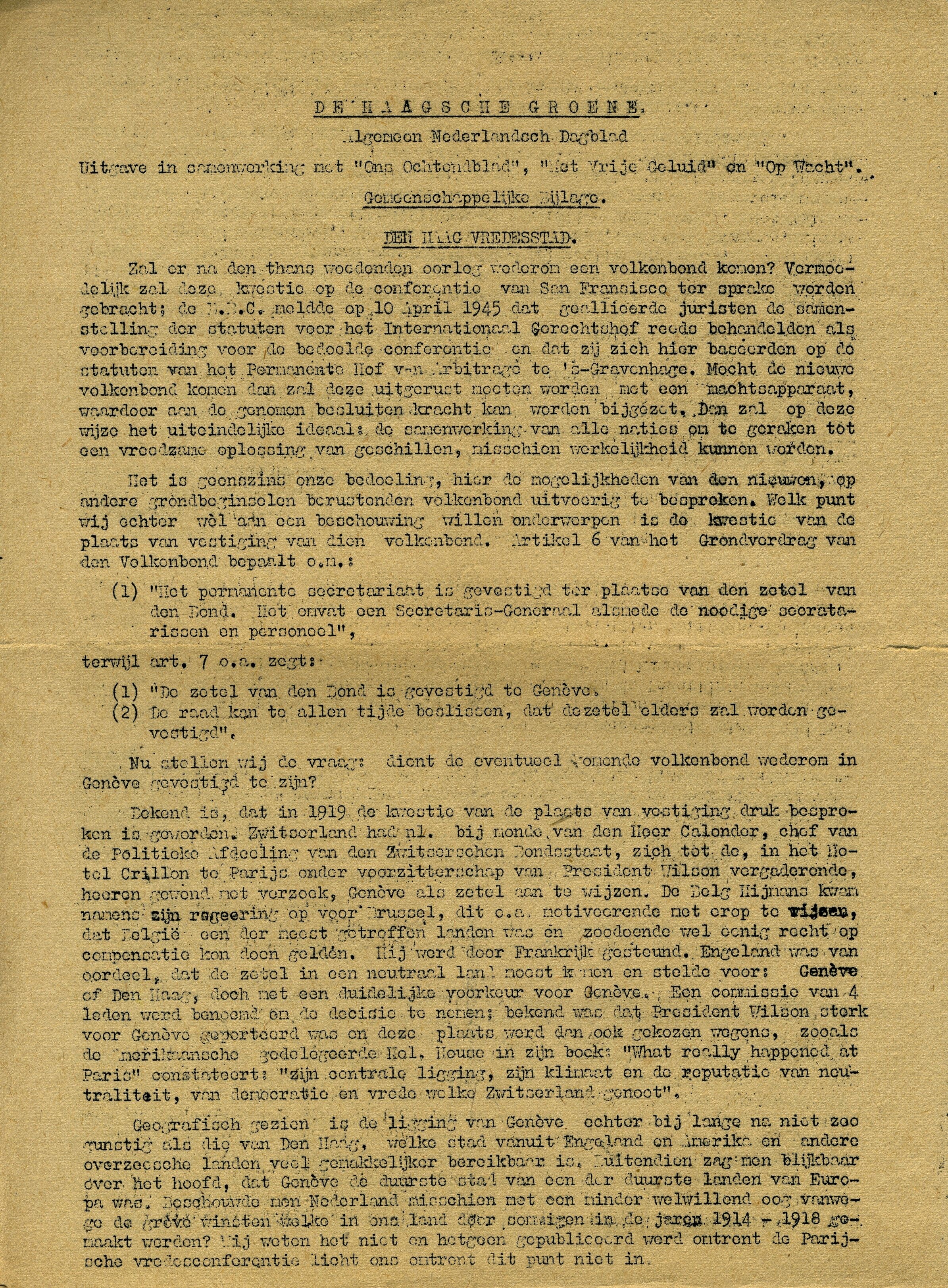 Het verzetskrantje in de vorm van één blad dat aan beide kanten is gestencild. Bovenaan: : "De Haagsche Groene. Algemeen Nederlandsch Dagblad. Uitgave in samenwerking met "Ons Ochtendblad", "Het Vrije Geluid" en "Op Wacht". Gemeenschappelijke Bijlage." De tekst op het bald heeft als kop: "Den Haag Vredesstad".