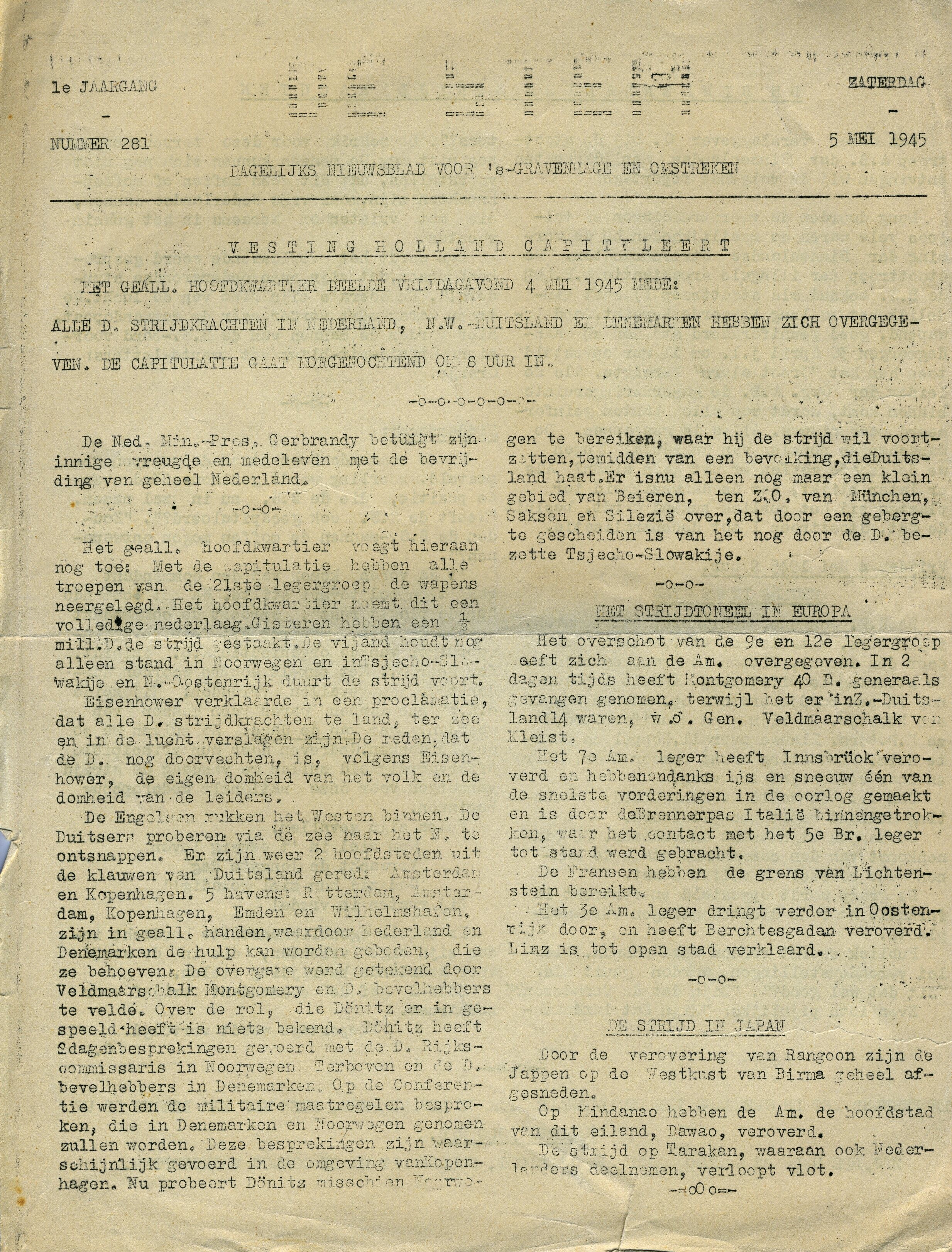 Het verzetskrantje in de vorm van één blad dat aan beide kanten is gestencild. Bovenaan: "De Stem 1e Jaargang - Nummer 281 Zaterdag 5 mei 1945 Dagelijks Nieuwsblad voor 's-Gravenhage en omstreken". Het hoodartikel heeft als kop: "Vesting Holland Capituleert".