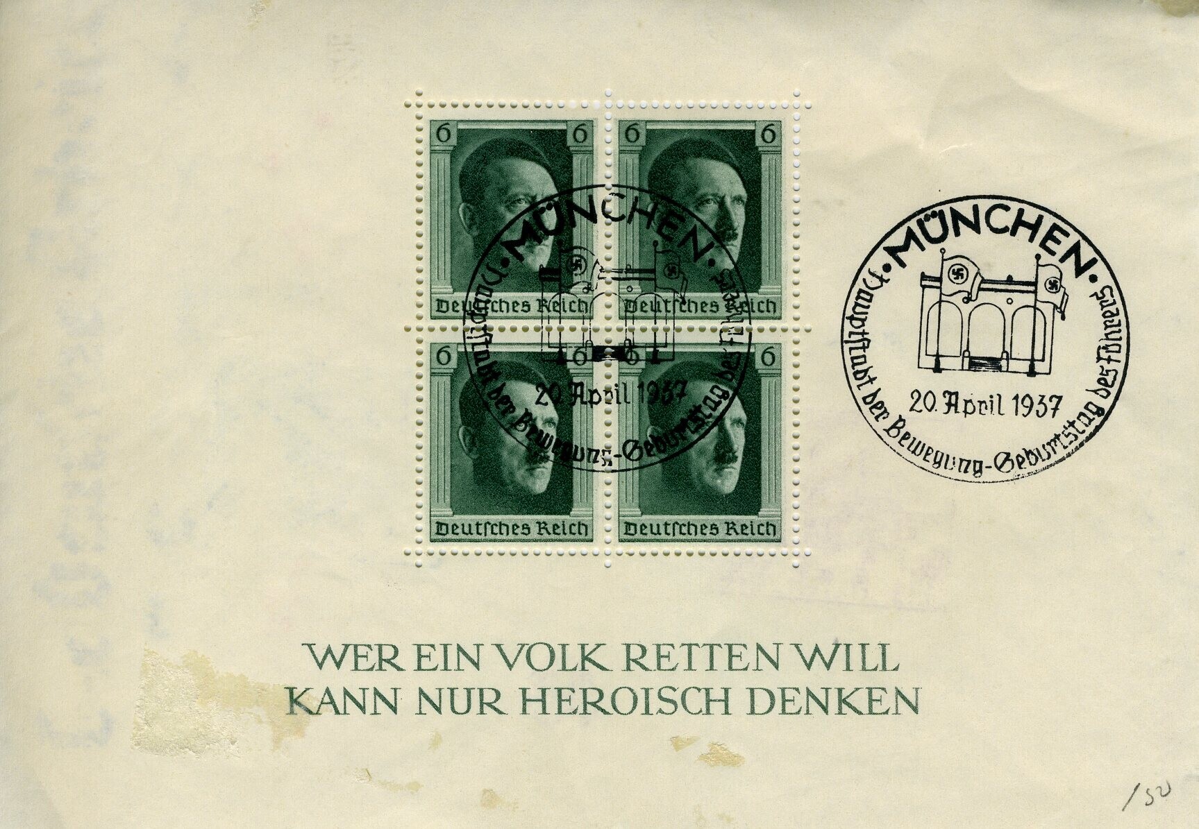 Een ongebruikt vel met in het midden vier postzegels met het portret van Adolf Hitler. Onder zijn afbeelding: "Deutsches Reich". De postzegels zijn afgestempeld en hetzelfde ronde stempel staat apart op het blad. Op het stempel staat de Feldherrnhalle in München afgebeeld met twee vlaggen met de swastika ervoor. Hieromheen de tekst: "München Haupstadt der Bewegung - Geburtstag des Führers" met het jaartal 20 april 1937. Onderaan op het blad staat: "Wer ein Volk retten will kann nur heroisch denken".