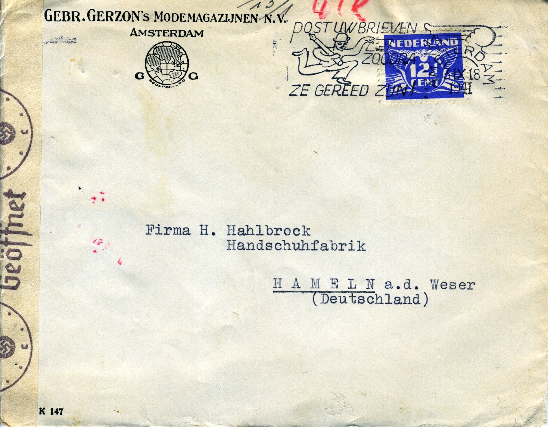 Een geopende lege enveloppe verstuurd door: "Gebr. Gerzon's Modemagazijnen N.V. Amsterdam" aan: "Firma H. Hahlbrock Handschuhfabrik Hameln a.d. Weser (Deutschland)" met afgestempelde Nederlandse postzegel. Langs de rand van de enveloppe is een papieren sluitband aangebracht met daarop afgedrukt in gotische letters: "Geöffnet" en met ronde zwarte en rode stempels waarop het symbool van het Derde Rijk, de adelaar met de swastika staat met de tekst: "Obercomando der Wehrmacht Geprüft".