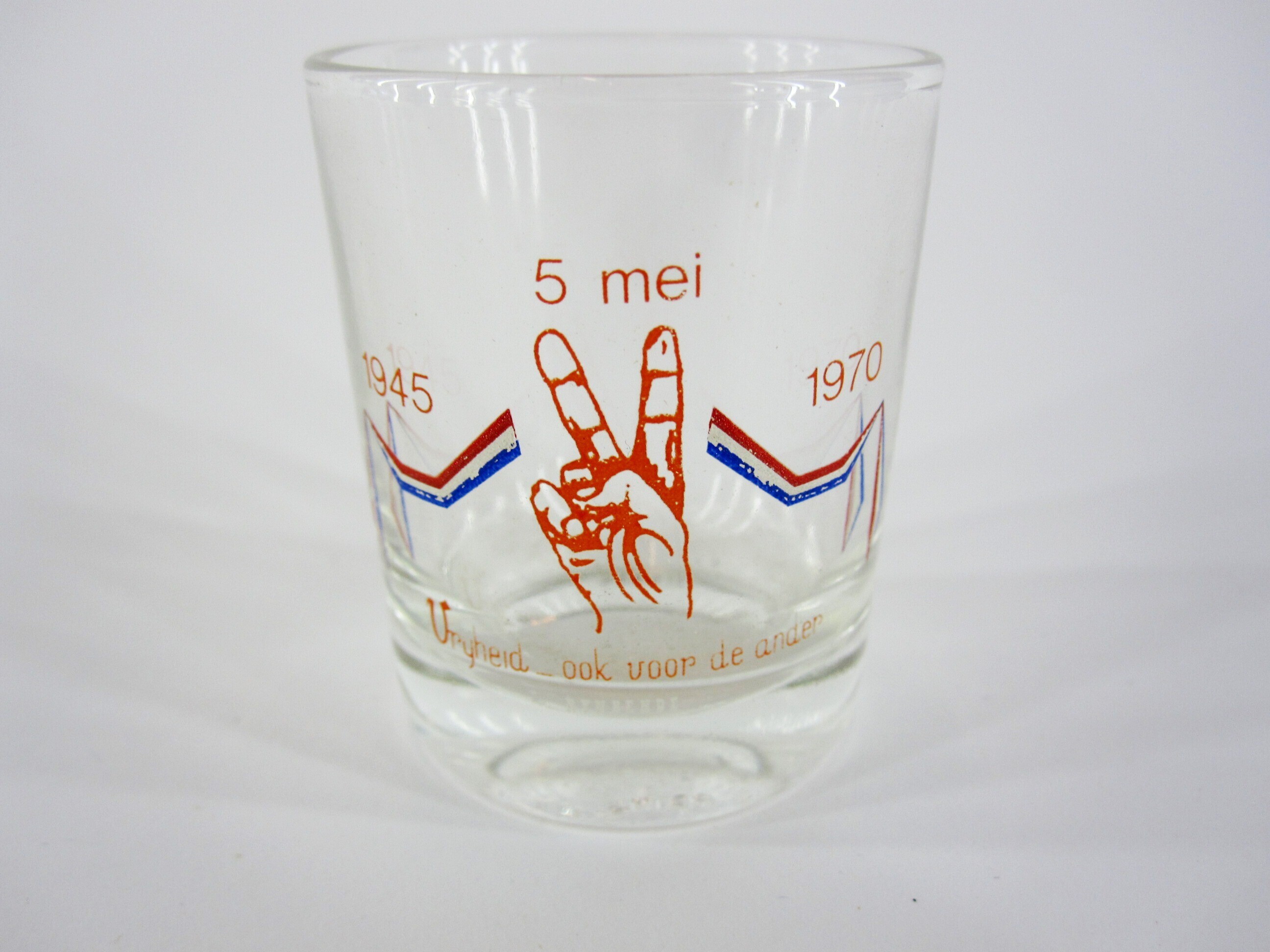 Een borrelglaasje met in oranje opdruk de voorstelling van een hand die het 'V'-teken maakt. Daarboven de datum: "5 mei" en links en rechts van de hand boven de Nederlandse driekleur de jaartallen: "1945" en "1970". Onder de hand staat eveneens in oranje opdruk: "Vrijheid ook voor anderen". Het glas is vervaardigd ter gelegenheid van de 25-jarige herdenking van de bevrijding.