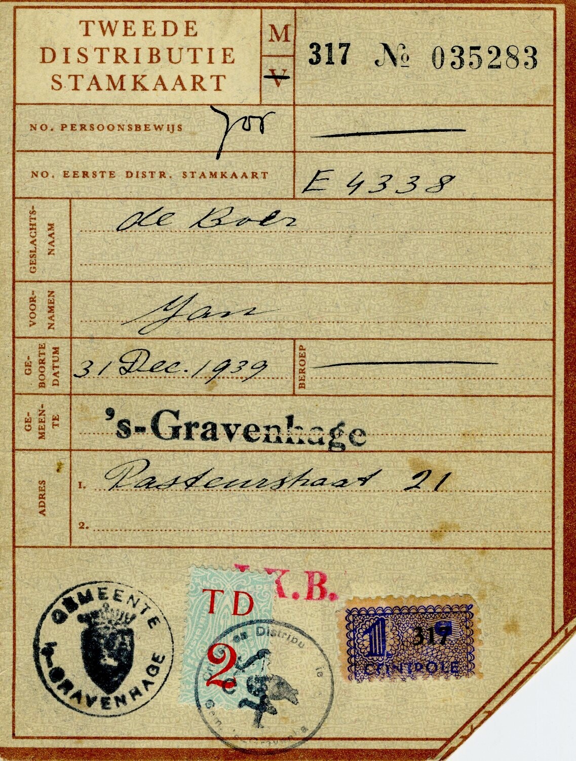 Een Tweede Distributie Stamkaart uitgegeven te Den Haag op naam van Jan de Boer geboren op 31 december 1939. Zijn moeder heeft dit voor hem en zijn broer Piet verzorgd. Op de kaart zijn o.a. de uitgereikte bonnen en bonkaarten genoteerd.