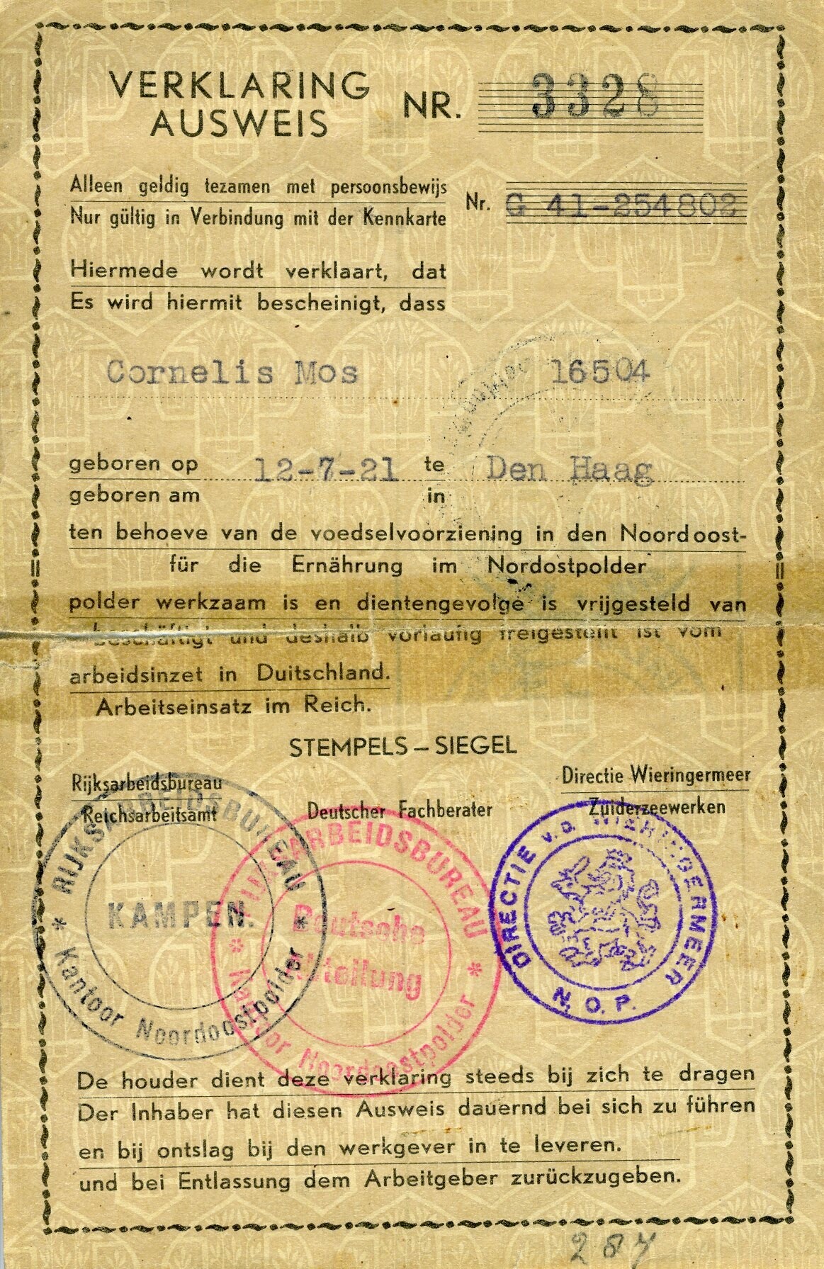 Een in het Nederlands en Duits opgestelde "Verklaring - Ausweis Nr. 3328" op naam van Cornelis Mos geboren op 12 juli 1921 te Den Haag en uitgegeven door het "Rijksarbeidsbureau, Directie Wieringermeer - Zuiderzeewerken" met stempels van onder andere het "Rijksbureau - Kantoor Noordoostpolder - Kampen" op 1 juli, 1 september en 1 november 1944.