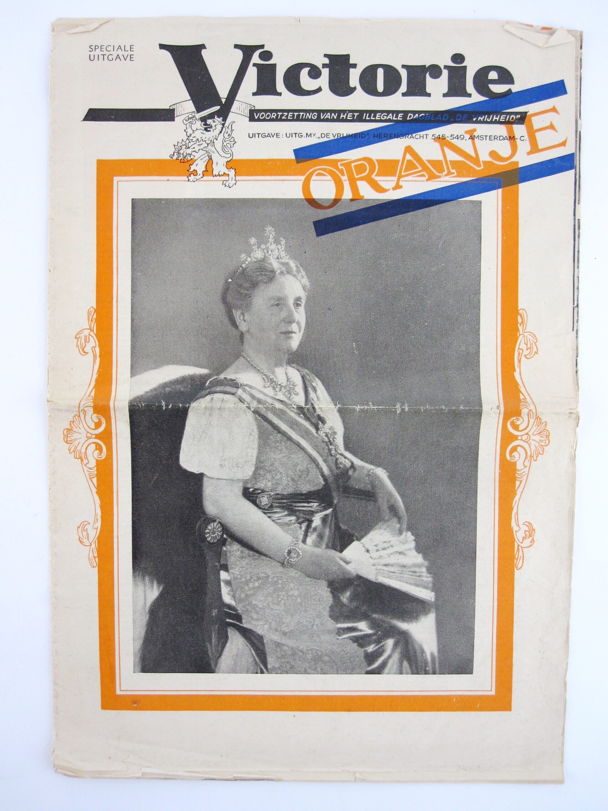 Een "Speciale uitgave" van het blad "Victorie. Voortzetting van het illegale dagblad "De Vrijheid" Uitgave: Uitg. My. "De Vrijheid", Herengracht 545-549, Amsterdam-C." met op de voorpagina een paginagrote zwart-wit foto van koningin Wilhelmina.