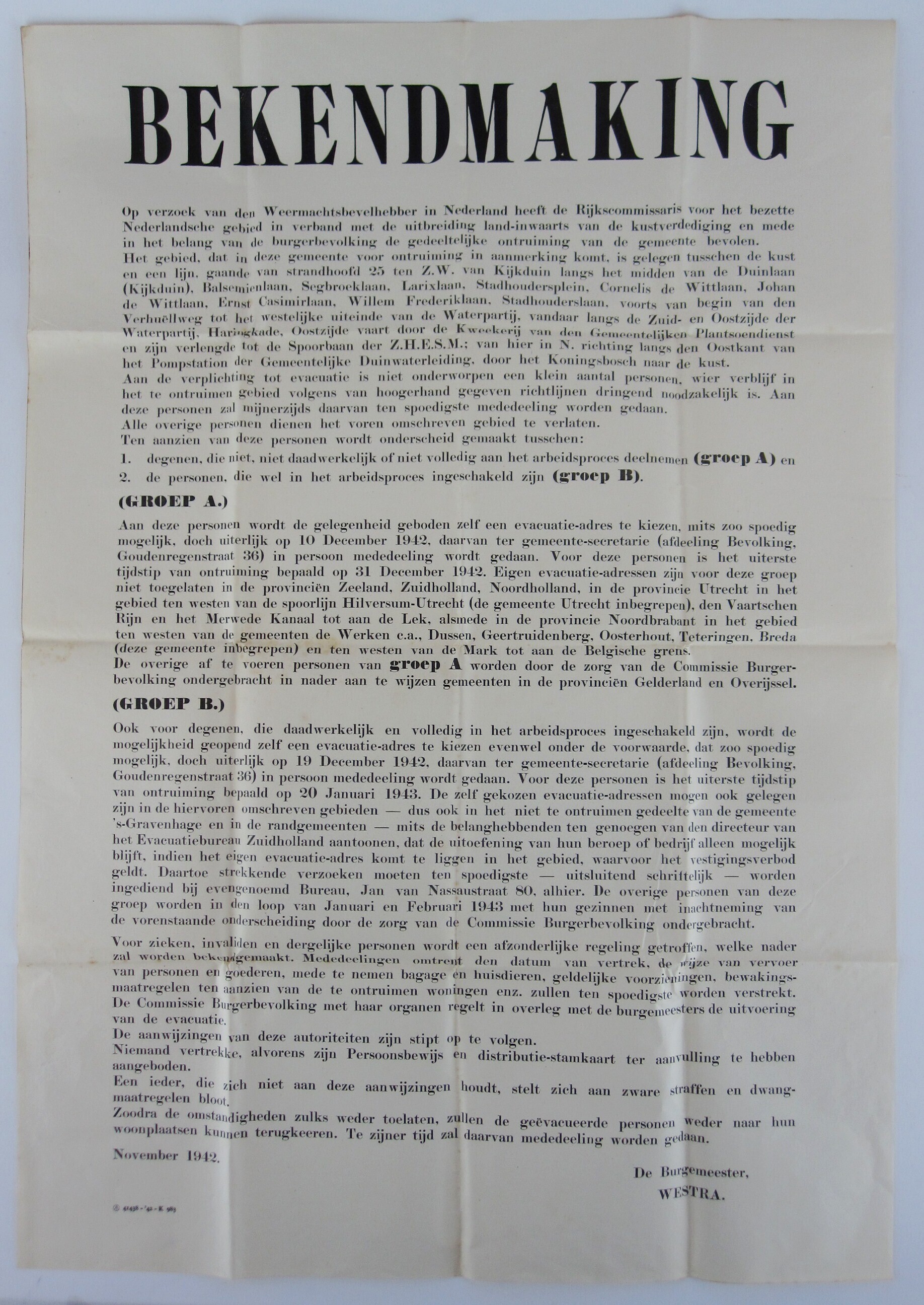 Een gedrukt affiche met als kop: "Bekendmaking". Hiermee werd de ontruiming voor de Atlantik Wall van specifieke stadsdelen langs de kust bekend gemaakt met de logistieke uitwerking. Gedateerd november 1942 en ondertekend door burgemeester Westra.