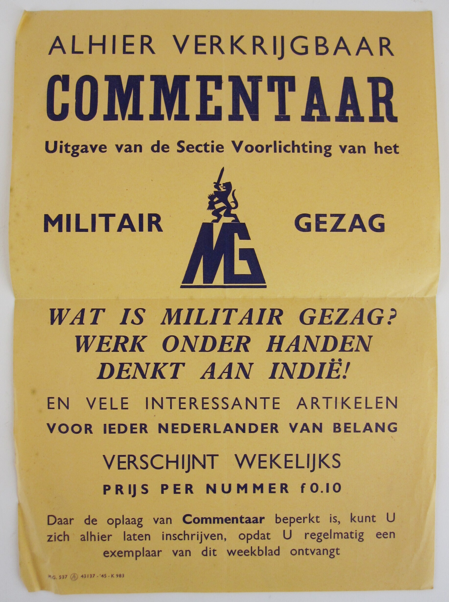 Een gedrukt affiche waarin reclame wordt gemaakt voor het weekblad "Commentaar" waarin onderwerpen worden behandeld als: "Wat is Militair Gezag? Werk onder handen. Denk aan Indië!" Het gaat om een weekblad dat wordt uitgegeven door de "Sectie Voorlichting van het Militair Gezag".