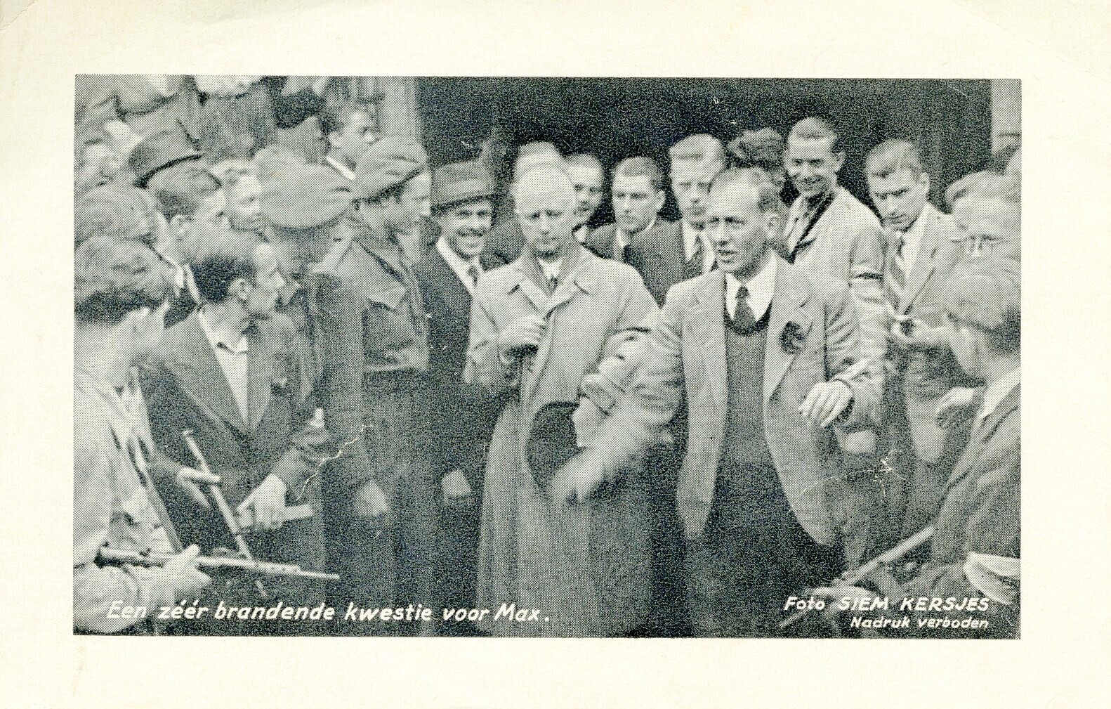 Een zwart-wit foto afgedrukt op dun papier van Max Blokzijl omgeven door mensen waarvan enkelen in militair uniform en verschillenden met wapens. Onderaan staat: "Een zéér brandende kwestie voor Max." en "Foto Siem Kersjes nadruk verboden".